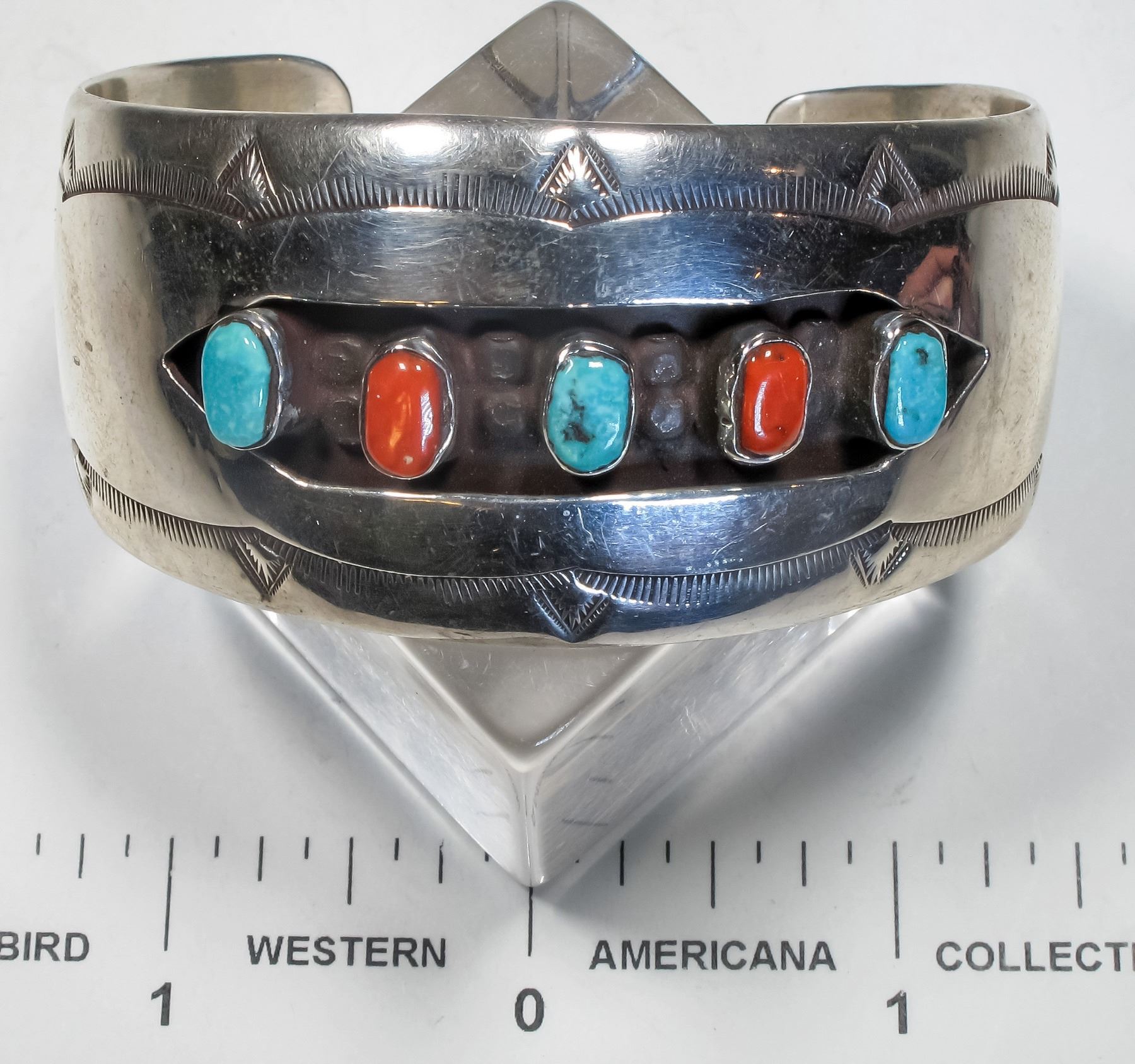 This is a nice vintage Navajo bracelet cuff set in a shadow box style with turquoise and coral stones, the band is about 1 ºí in width, unsigned piece.