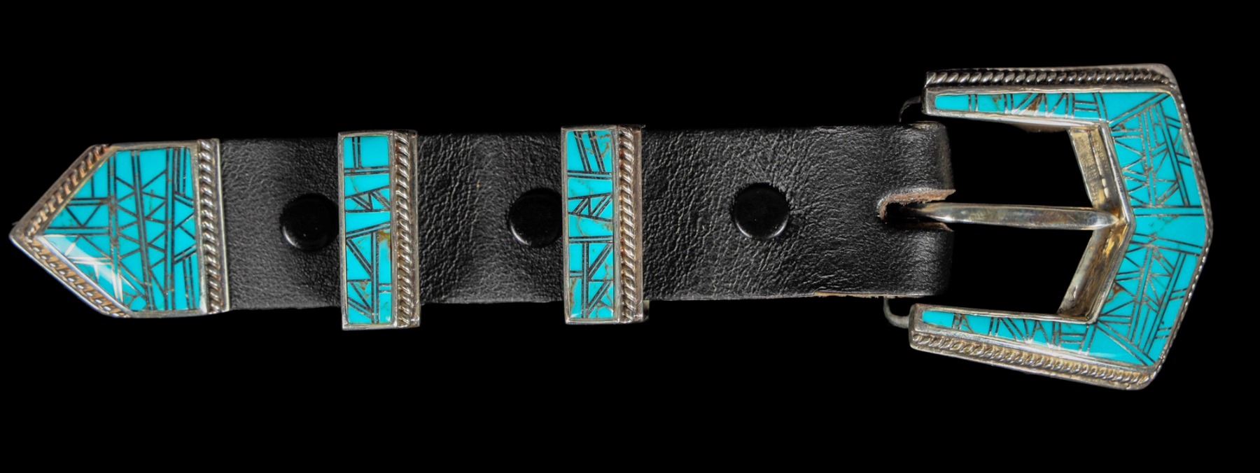 This is a beautiful Ranger Set done in turquoise and sterling silver, the set consist of an 1 3/4' wide buckle, two 1" keepers and a 1" tip, the piece will accommodate a 1" wide belt. Please note this is a non-native American made item.
