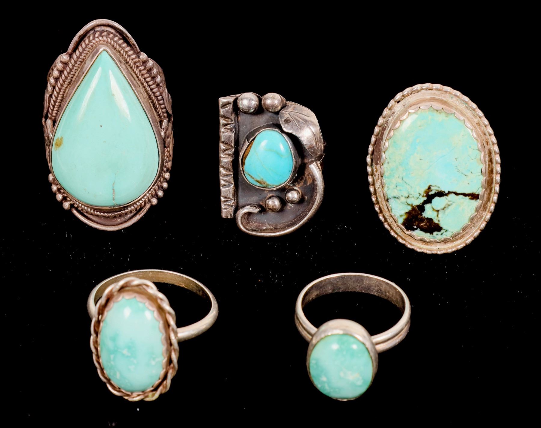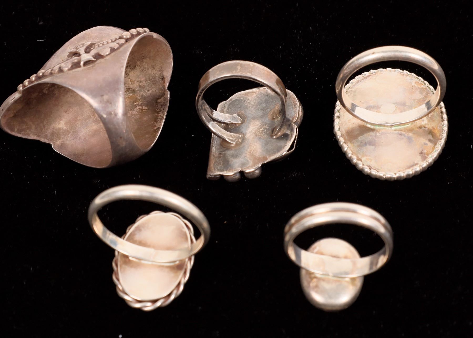 Unmarked D shaped size 5. Unmarked single band oval size about 10. Unmarked large spade shaped size 10.5. Unmarked oval dual band like, size 7.5. Unmarked l4arge oval size 10.2.