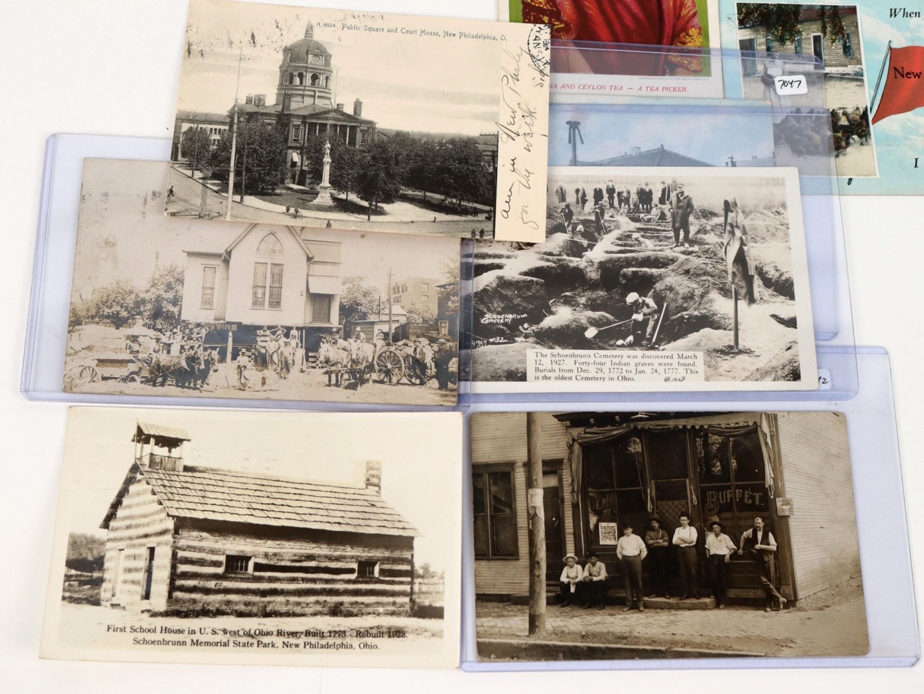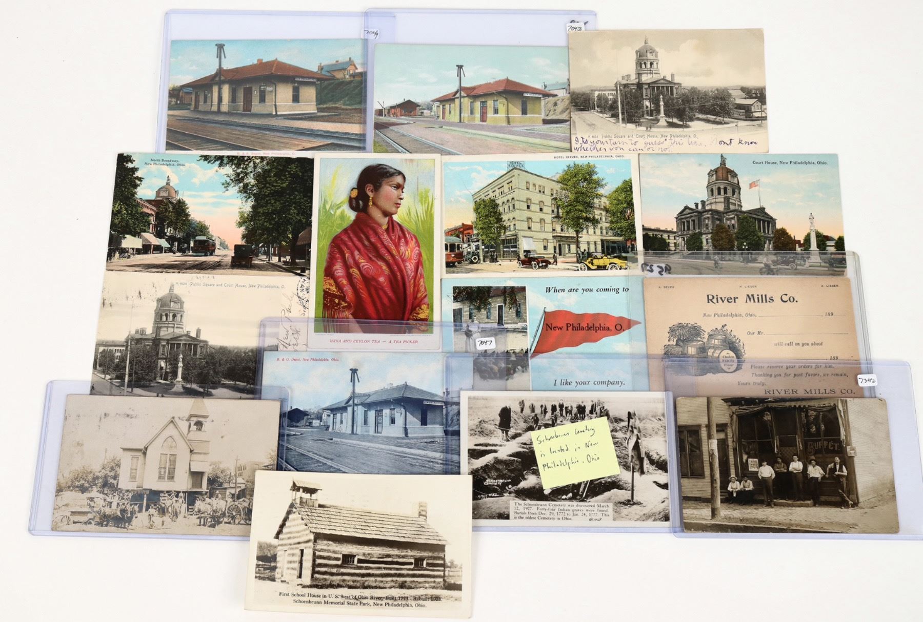 15 New Philadelphia postcards. RPC's-Street group portrait, first school house..., building, Schoenbrunn cemetery. Also, B & O depot, North Broadway, Hotel Reeves, courthouse etc.