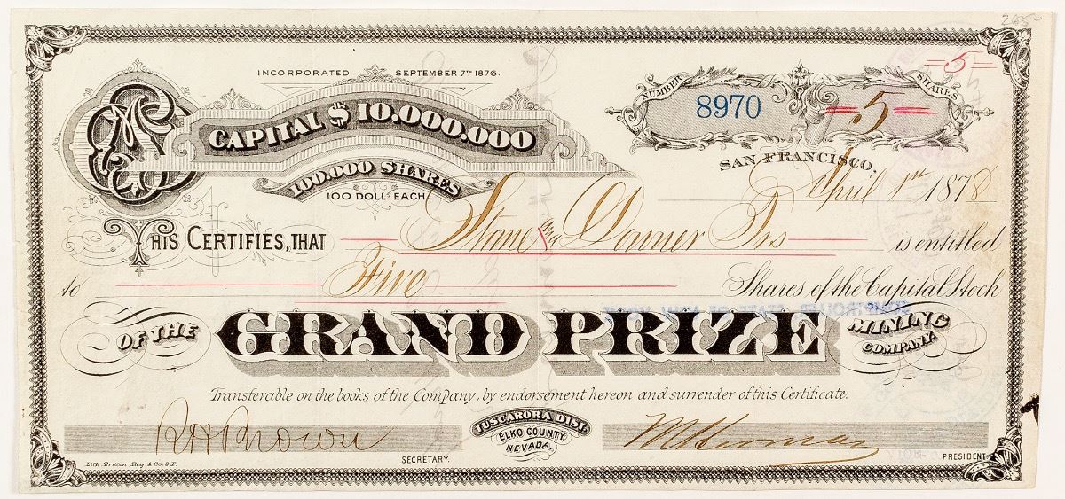 Grand Prize, number 8970 for 5 shares to Stone & Downer in 1878. Signed by RH Brown and M Hennas. Four assessment stamps on back. The Grand Prize is listed as existing from 1876-1890 producing $2.5 million. Grand Prize was an important mine. By the time 1878 rolled in the population of Tuscarora had swelled to 5,000. Streets and alleys were declared public highways to prevent men from staking out claims on the thoroughfares. A ten-stamp mill went into operation. Miners' wages were up to four dollars a day. Oh, those were grand times! But they didn't last long. (Couch, 1943, p.46). Prag collection. City: Tuscarora State: Nevada Date: 1878 ID# 31006