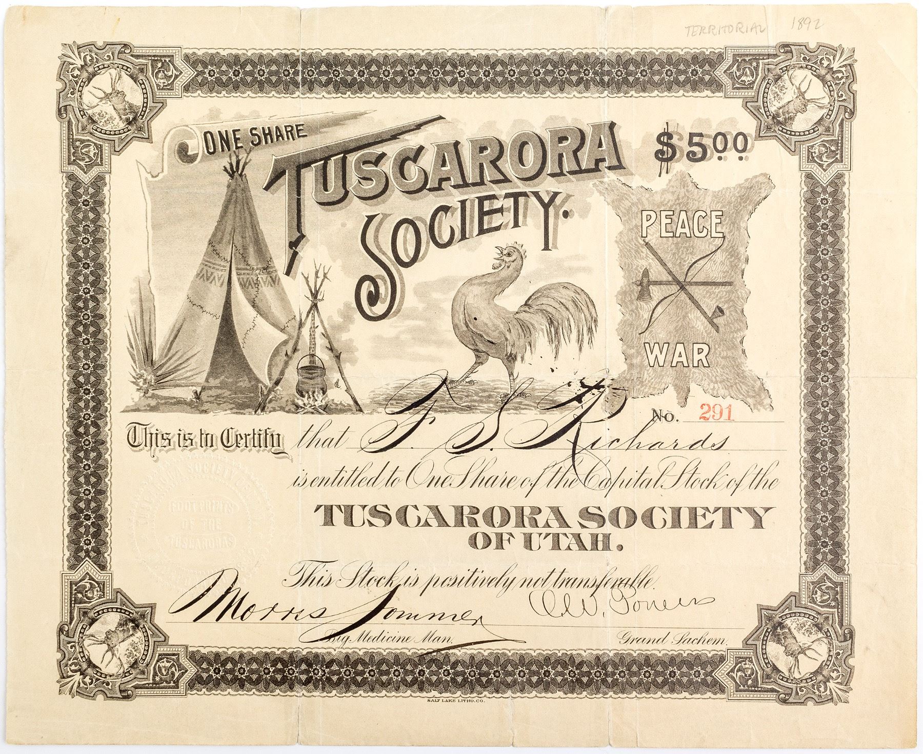 One $5.00 share to F. S. Richards. Signed by OW Powers and Morris Sommely(?). Vignettes of a rooster, tent, guitar burning on an open fire, and peace/war Native American symbols. Rips at edges of folds, Territorial Utah. Anticipating the division on national party lines; Judge Powers organized what was known as the Tuscarora Society. This Democratic Liberal society grew to a membership of eleven hundred and was a strong political factor. In 1892 the Tuscarora Society ran a special train containing a drum corps and about sixty members of the organization to the National Democratic Convention at Chicago which Judge Powers and Mr. Fred J Kiesel attended as delegates from Utah representing the Liberal wing of the local Democracy. Their right to sit as delegates was contested by Judge Henderson and Hon John T Caine who had been sent by the newly formed Democratic Party of Utah. The latter were seated. Soon afterwards the Tuscarora Society merged with the regular Democratic Party. Judge Powers was now elected a member of the Territorial legislature serving during the session of 1893. In 1895 he was unanimously chosen chairman of the Democratic Territorial Central Committee and waged a very energetic campaign. ["History of Utah, Volume 4" by Whitney] State: Utah City: HWAC#: 46794 Date: 1892