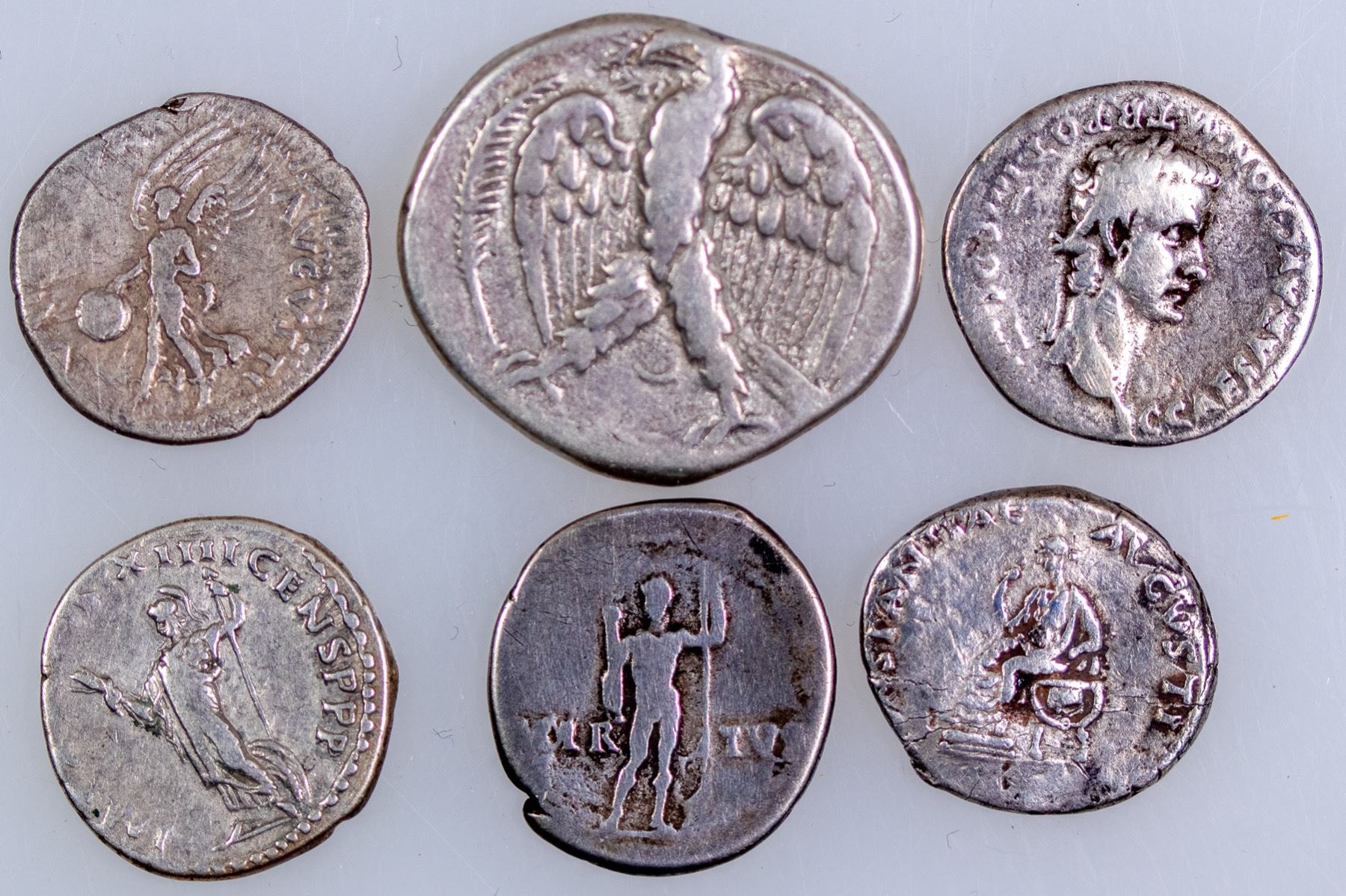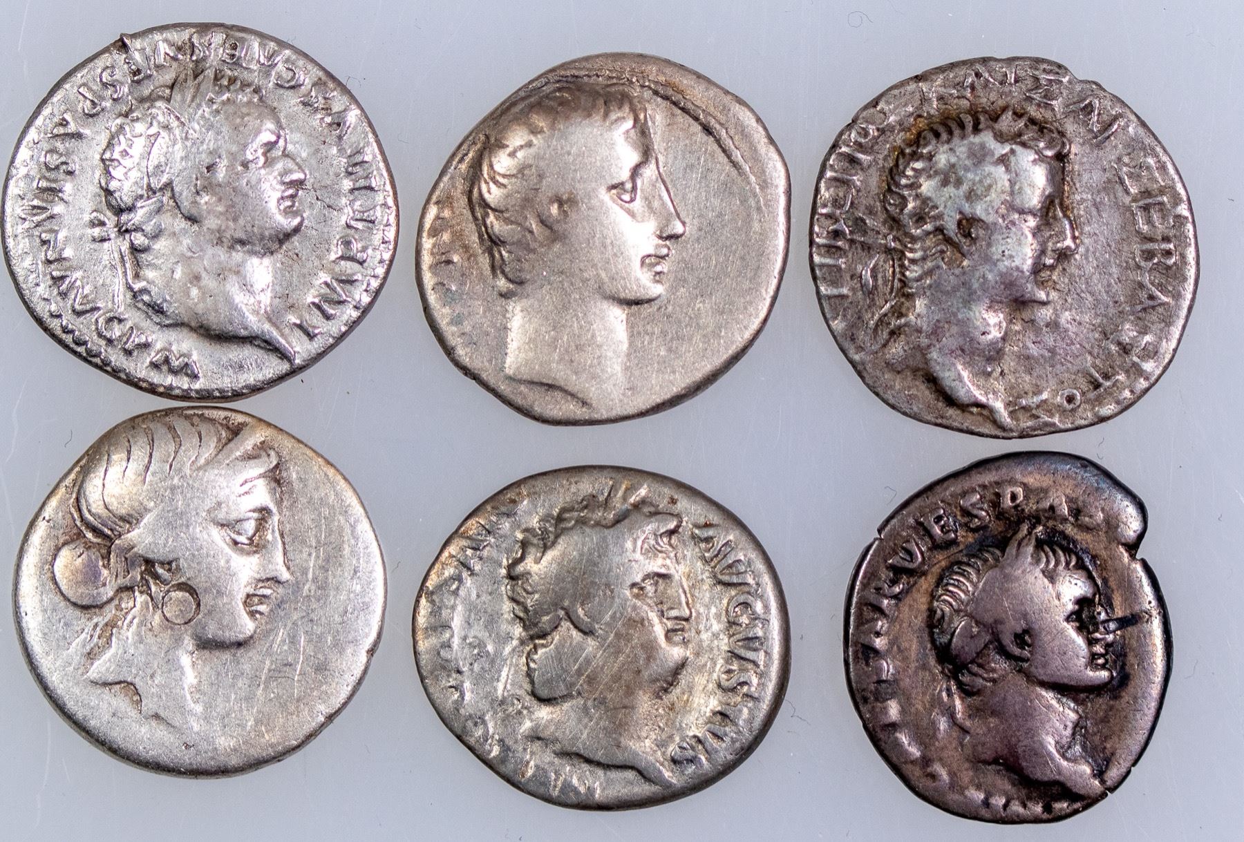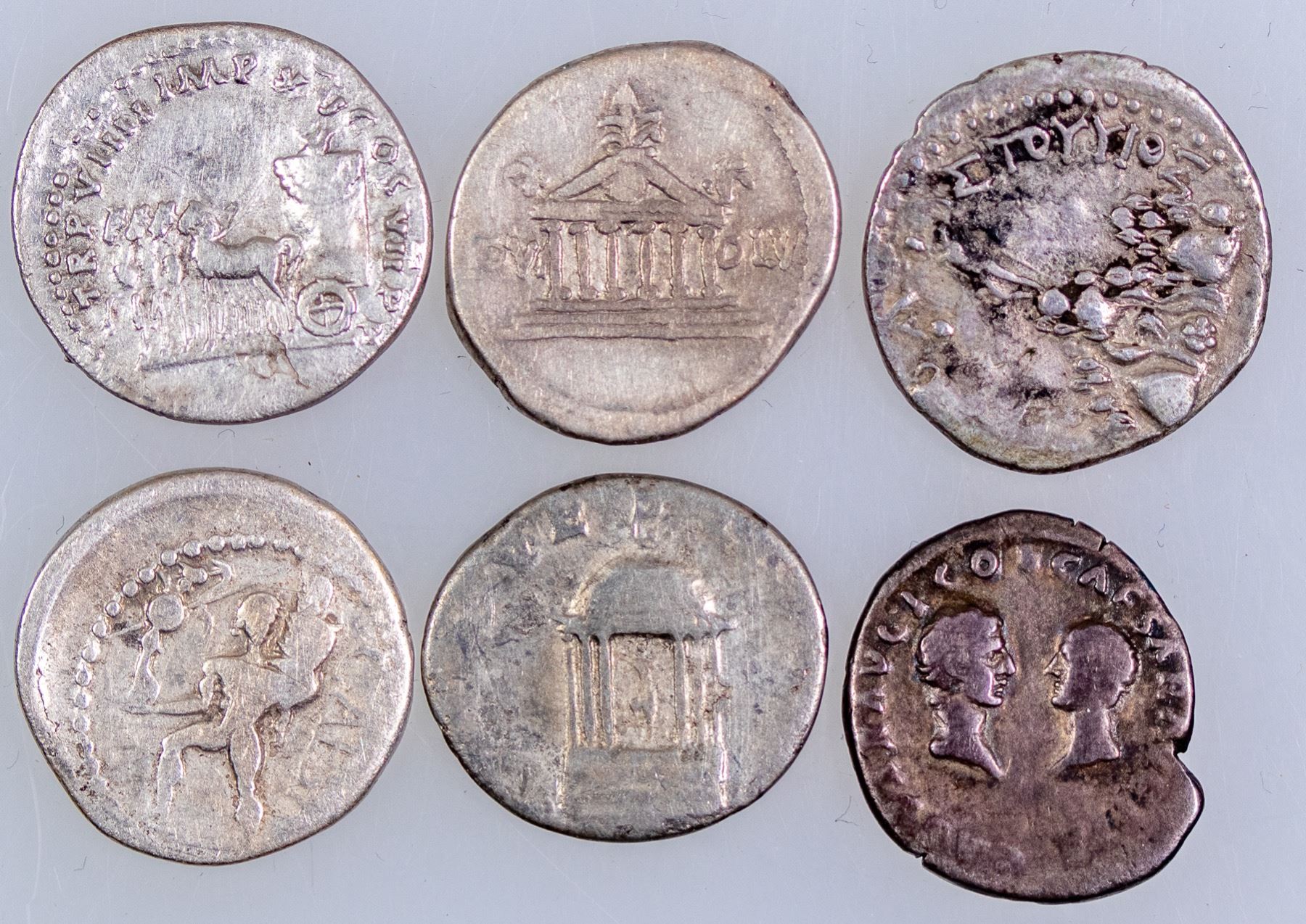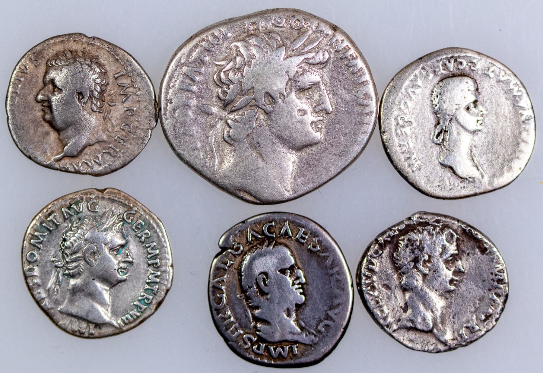 12 Caesars in silver: Julius Caesar Venus/Aeneas carrying father and Palladium. (He claimed descent from Venus). Augustus with temple of Salamis, Cyprus. Cyprus because a personal fief. Tiberius displays the temple on Mt. Argaeus in Cappadocia, Caligula has Agrippina the elder on revers, his mother. Galba has Virtus, virtue or power. Otho is on a tetradrachm of Antioch. Vitallius promises victory. Vespasian has sons Titus and Domitian on reverse. Titus displays a funeral quadriga. Domitian has Minerva on reverses. Good silver, nice portraits. About fine.
