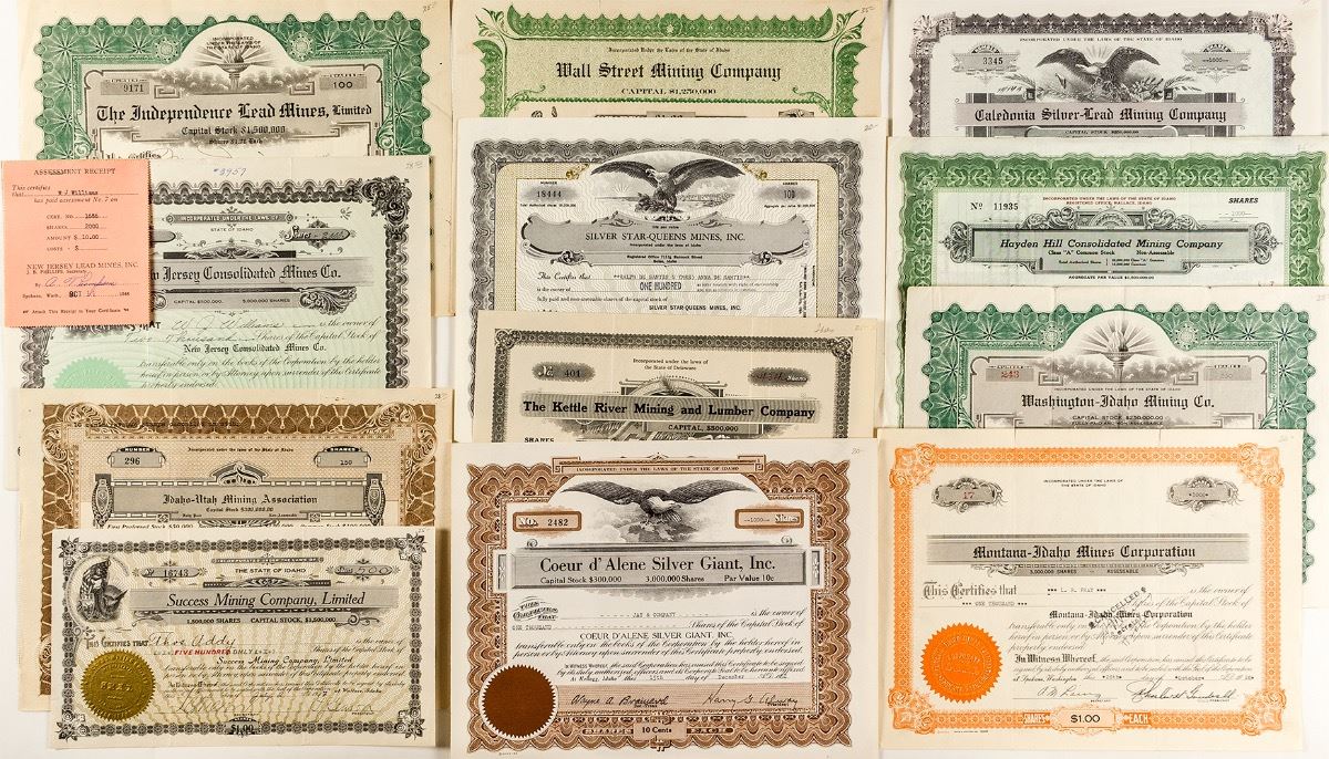 Includes: Independence Lead Mines (1922, not cxl), Montana-Idaho Mines Corp. (1926, stamp cxl), Washington-Idaho Mining Co. (1930, not cxl), Hayden Hill Consolidated Mining Co. (1951, not cxl), Caledonia Silver-lead Mining Co. (1953, not cxl), The Kettle River Mining and Lumber Co. (1917, not cxl), Coeur d'Alene Silver Giant (1952, not cxl), Silver Star-Queens Mines (1968, not cxl), Wall Street Mining Co. (1910, pen cxl), Idaho-Utah Mining Assoc. (1922, not cxl), Success Mining Co. (1912, not cxl), and New Jersey Cons. Mines Co. (1928, not cxl). (Prag Collection) City: State: Idaho Date: 1910-1968 hwac# 34058