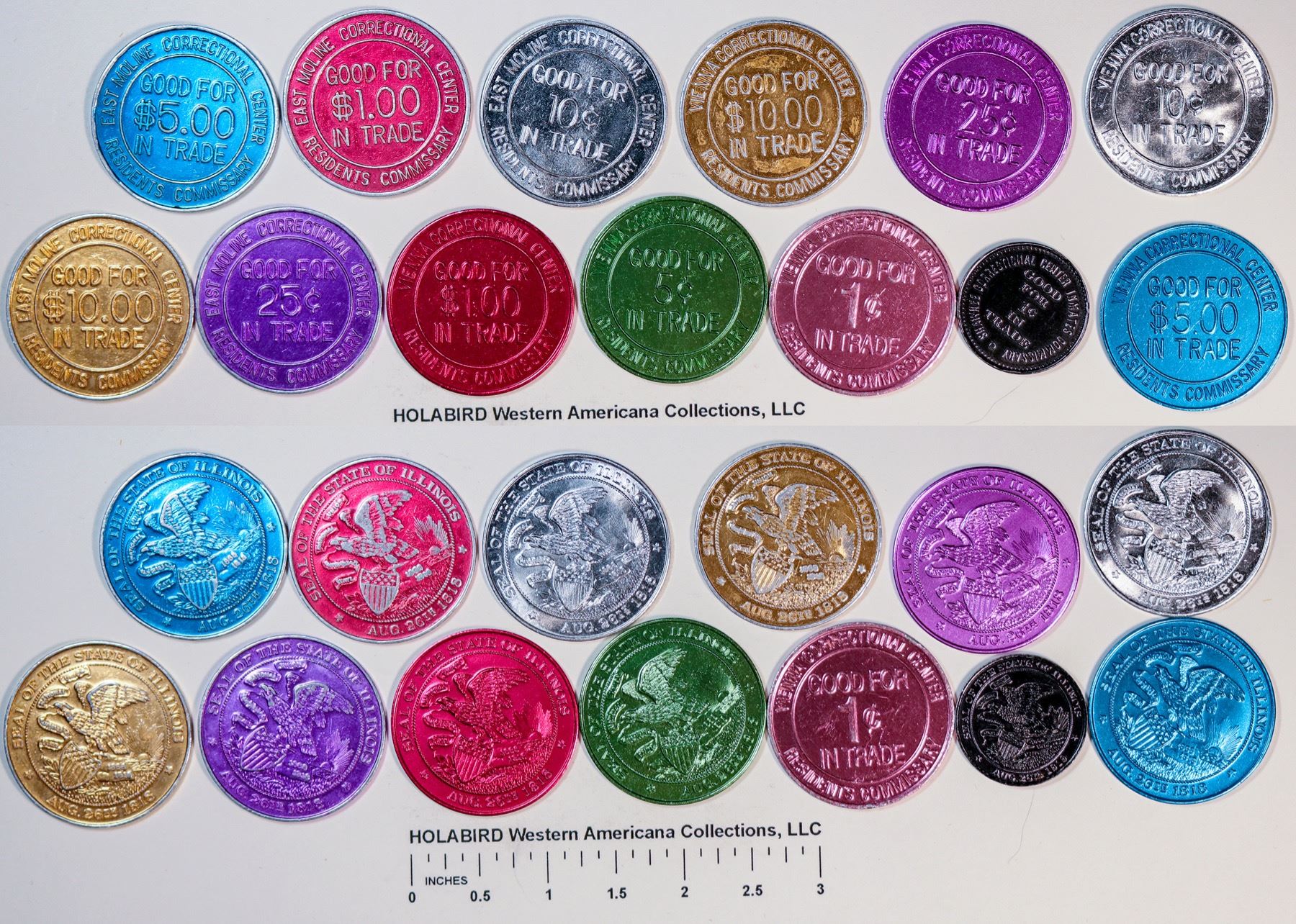 1. Vienna Correctional/GF/$5/ Residents' Commissary// State Seal//Blue// aluminum//32mm 2. Vienna Correctional/GF/25cents/In Trade/Residents' Commissary//State Seal//purple//aluminum//32mm 3. Vienna Correctional/Residents' Commissary/GF/$1/In Trade//State Seal//red//aluminum//32mm 4. Vienna Correctional/GF/$10/Residents' Commissary/GF/$10/In Trade//State Seal//Silver//aluminum//32mm 5. Vienna Correctional/Residents' Commissary/GF/10 cents/In Trade//State Seal//red//aluminum//32mm. 6. Vienna Correctional/Residents' Commissary/GF/5 cents/In Trade//State Seal//Green//aluminum//32mm. 7. Vienna Correctional/Residents' Commissary/GF/1 cents/In Trade//State Seal//red//aluminum//32mm. 8. East Molino Correctional/GF/$1/Residents'Commissary//State Seal//Red//aluminum//32mm 9. East Molino Correcetional/GF/$5/Residents' Commissary//State Seal//Blue//aluminum//32mm 10. East Molino Correctional/GF/10 cents/In Trade/Residents' Commissary//State Seal//Silver//aluminum//32mm 11. East Molina Correctional/GF/25 cents/In Trade/Residents'Commissary//State Seal//Red//aluminum//32mm 12. East Molina Correctional/GF/$10/InTrade/Residents'Commissary//State Seal//Gold//aluminum//32mm 13. Shawnee Correctional/GF/1Cent/In Trade/Inmates' Commissary//State Seal//Black//aluminum//16mm Please see photos for more detail and condition.