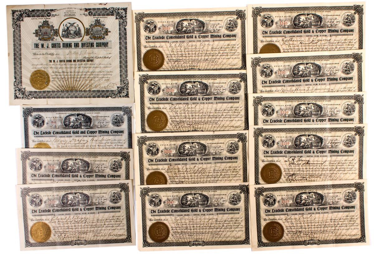 Lot of 12 fully executed certificates, non-sequentially numbered. All feature signatures by H. Earl Furman, president and W.J. Curtis, secretary. Dates range from September of 1904 through October 1908. Serial numbers of the typically 500 to 2000 share documents begin at 771 and end at 1228, which is for 1250 sharers. All have a gold embossed seal, and full documentation on the reverse sides. There is a single certificate for the W.J. Curtis Mining and Investing Company in this lot, # 15 for 10 shares, dated October 5, 1908. The secretary, W.J. Curtis, apparently opened his own company, in Albany NY. The Laclede Company was organized in 1900, offices based in Albany NY, and 160 acres of mining operations in the Blue mountains of Oregon. All documents measure approx. 10"x5.5", and are in good to very good condition. City: Union County State: Oregon Date: 1904 hwac# 62567