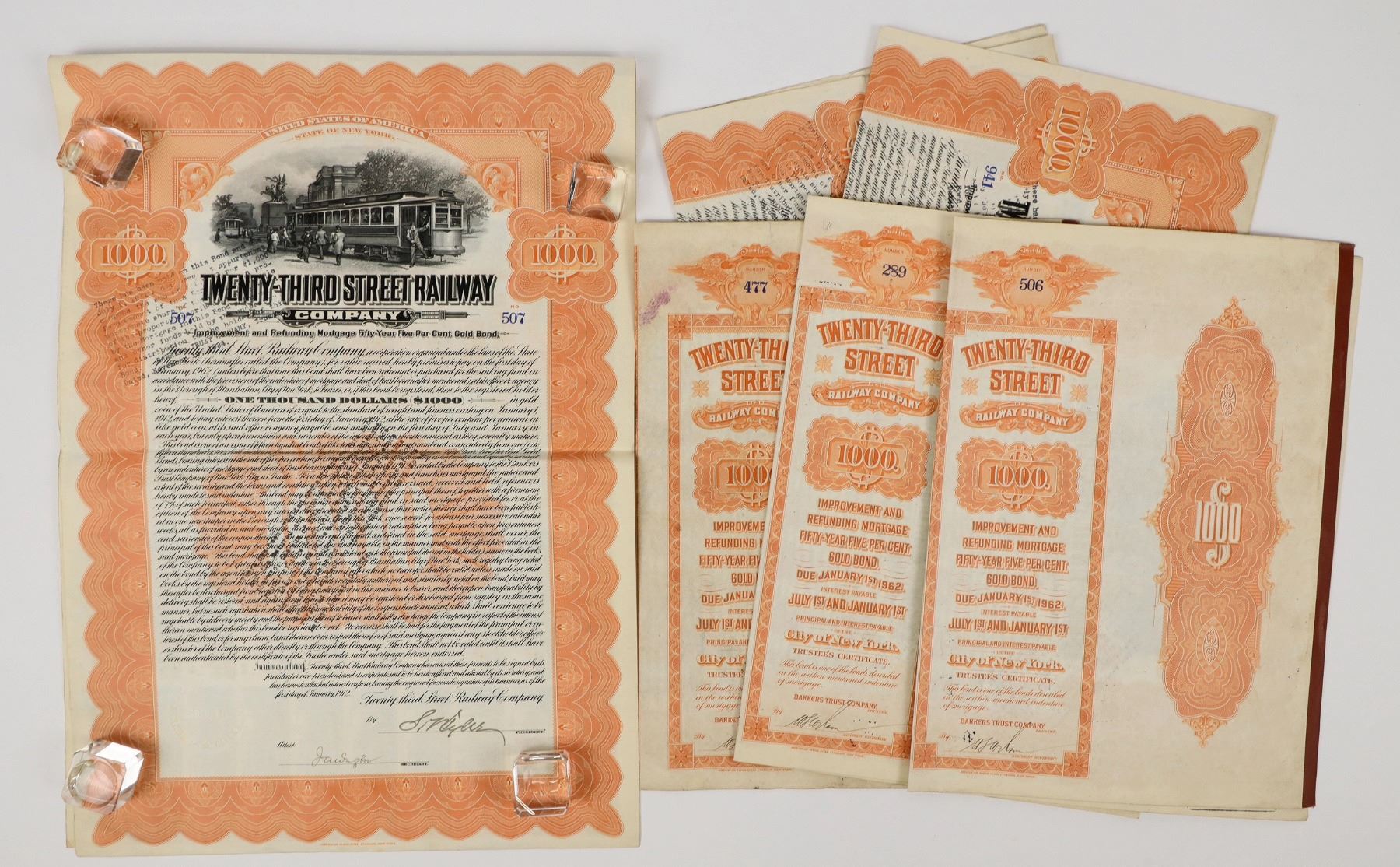 Lot of six. I/U. Issued 1912. EF cond. Twenty-Third Street Railway Co.., $1000, 5% gold bearer bond. with coupons. One of the better vignettes of a street car. American BNC printer.