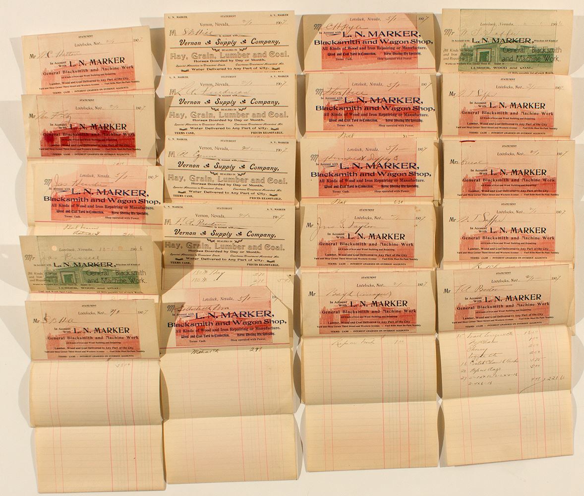 Four Vernon Supply Company small billheads. Sixteen L. N. Marker General Blacksmith billheads. Three different in four color variations.