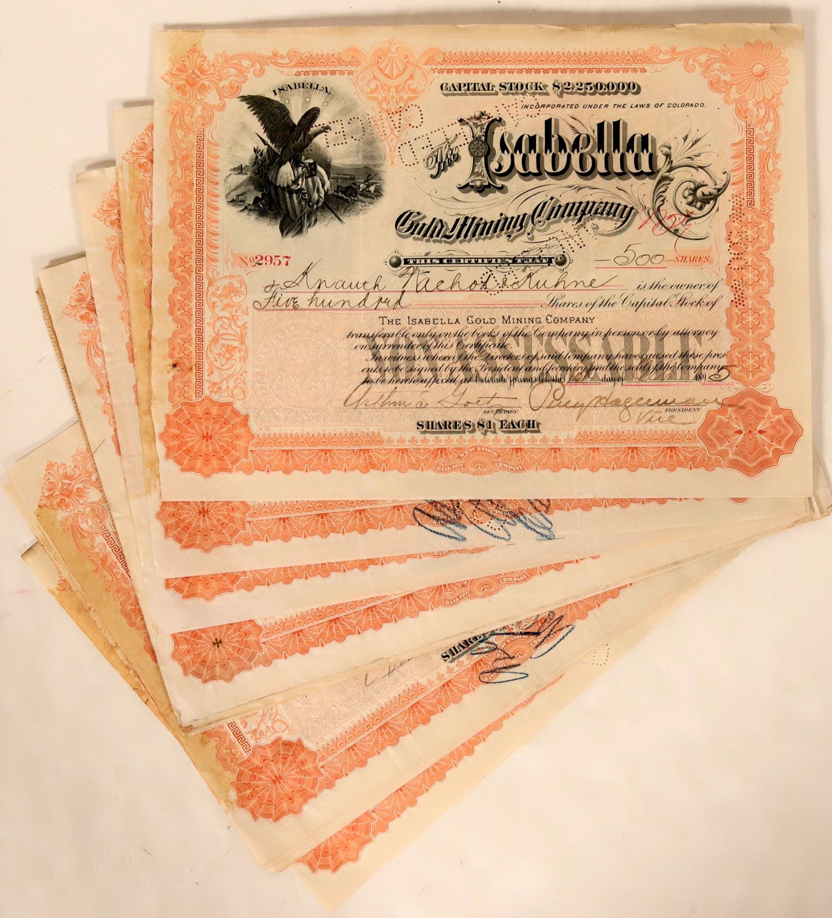 Twenty-one Isabella Gold Mining Company stock certificates issued 1895-1896. All signed by J.J. Hagerman, an important Colorado railroad and mining figure who owned the Mollie Gibson and Isabella mining companies as well as the Colorado Midland Railroad. He was one of the mine owners who precipitated the Cripple Creek Miner's Strike of 1894. Later in life, he also got into ranching in New Mexico. All three stocks are punch cancelled with folds and small rips.