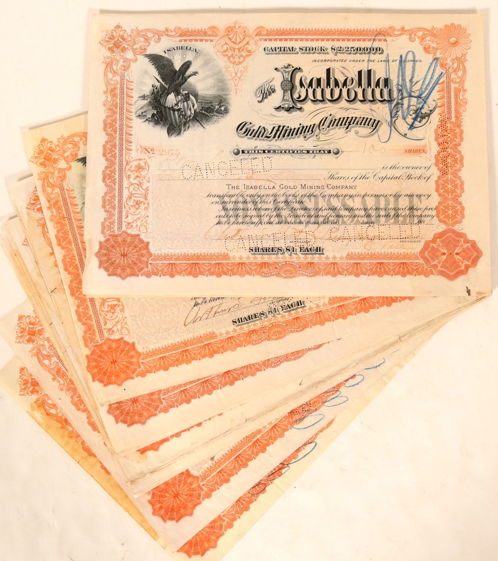 Twenty-one Isabella Gold Mining Company stock certificates issued 1895-1896. All signed by J.J. Hagerman, an important Colorado railroad and mining figure who owned the Mollie Gibson and Isabella mining companies as well as the Colorado Midland Railroad. He was one of the mine owners who precipitated the Cripple Creek Miner's Strike of 1894. Later in life, he also got into ranching in New Mexico. All three stocks are punch cancelled with folds and small rips.