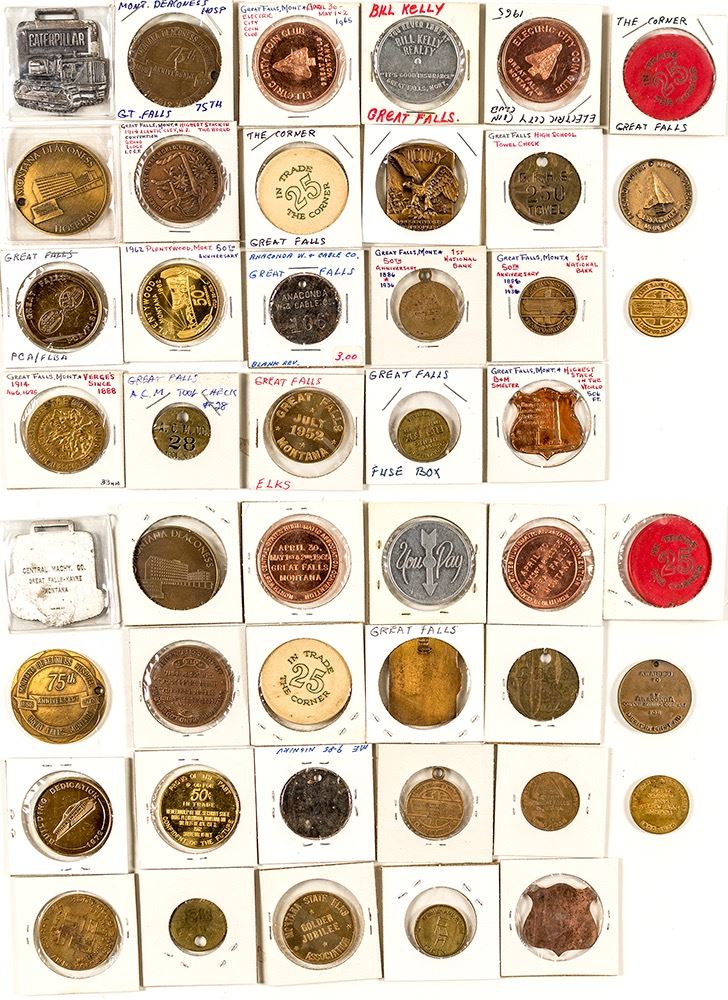 1) Central Machine Co., Caterpillar. 2) Victory (raised eagle) 3) Three First National Bank, 50th Anniversary. 4) Two Anaconda Copper Mining Merit in First Aid Award. 5) Two Montana Deaconess Hospital, 75th Anniversary. 6) Grand Lodge Convention, Highest Stack in the World, 1914. 7) Two Electric City Coin Club, Numismatic Convention. 8) Elks Golden Jubilee, 1952. 9) B & M Smelter, Highest Stack in the World. 10) PCA/FLBA Building Dedication, 1979. 11) Plentiwood, 50th Anniversary. 12) Fuse Box, Family Amusement. 13) Anaconda W. & Cable 106. 14) Verge's, Good Luck. 15) A. C. M. Co. 28 Toolcheck. 16) G. F. H. S. 250 Towel. 17) Bill Kelly Realty. 18) Two The Corner 25c IT. (Svoboda Collection) City: Great Falls State: Montana Date: HWAC# 33868