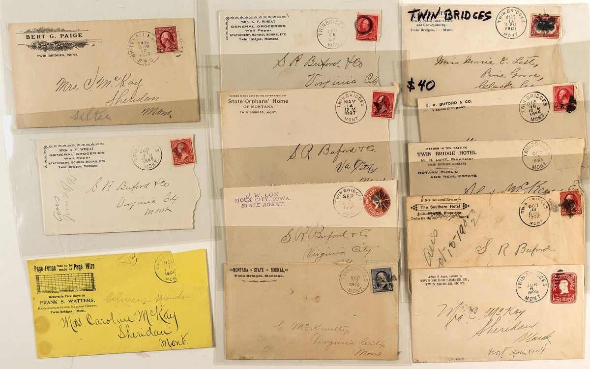 Lot of twelve: pictorial Watters Fence & Wire, Paige fancy general merchandise, two Mrs. AF Wheat groceries, Twin Bridges Lumber, State Orphans Home, JW Cox Sioux City State Agent, SR Buford Virginia City, Twin Bridges Hotel, Southern Hotel, Montana State Normal, MH Lott. (Svoboda Collection) City: Twin Bridges State: Montana Date: 1890-1905 HWAC# 27971