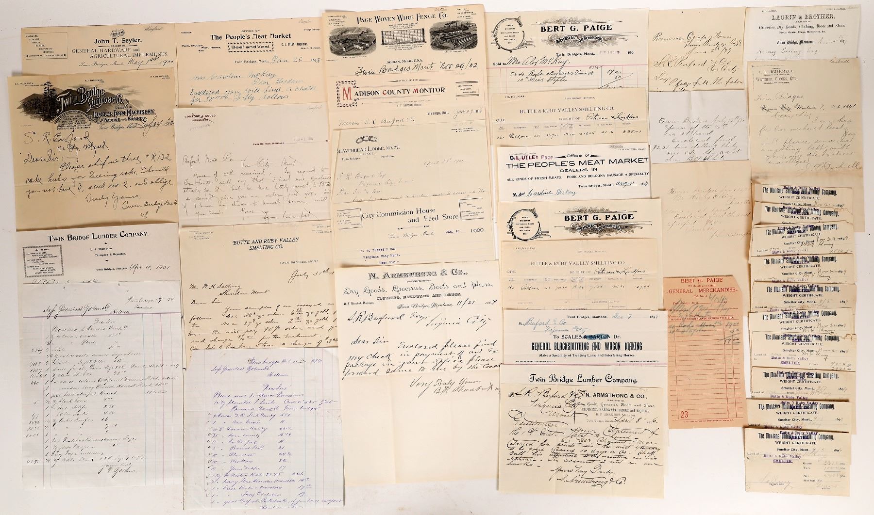 About 35 pieces of Twin Bridges ephemera, c. 1879-1901. Letterheads, Butte & Ruby Valley Smelting assay report, Montana Mining and Smelting weight receipts, billheads, IOOF, etc. See photo. Montana Twin Bridges