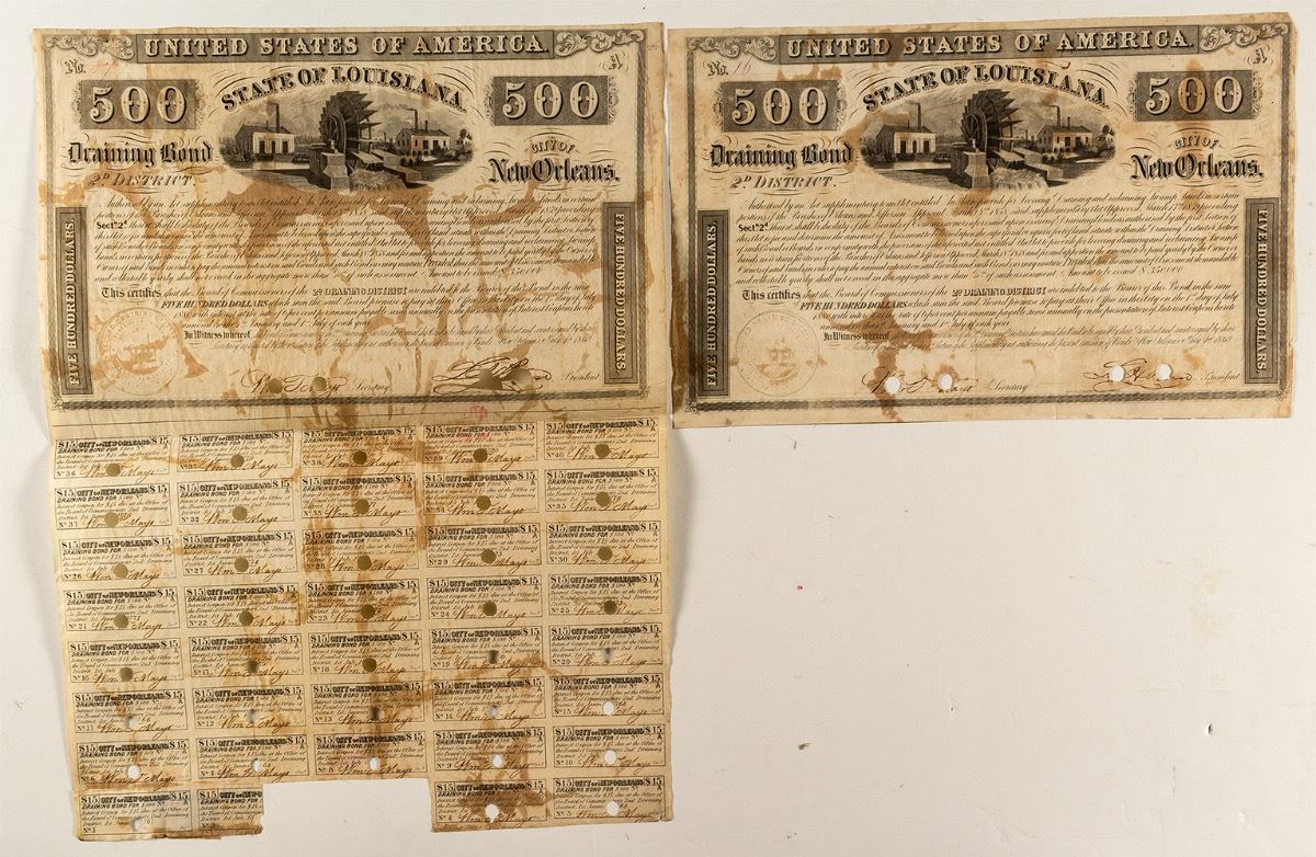 Rare. Two $500 bonds issued for the 2nd Draining District, New Orleans, in 1860. Feature a gorgeous vignette of paddle wheel and factories. Punch cancelled. One has 39 coupons, the other none. Printed by J.T. Hammond, New Orleans. Definite condition issues: delicate paper with heavy soiling, folds and some tears. 8.5" x 13.5" (Prag Collection) City: New Orleans State: Louisiana Date: 1860 hwac# 34715