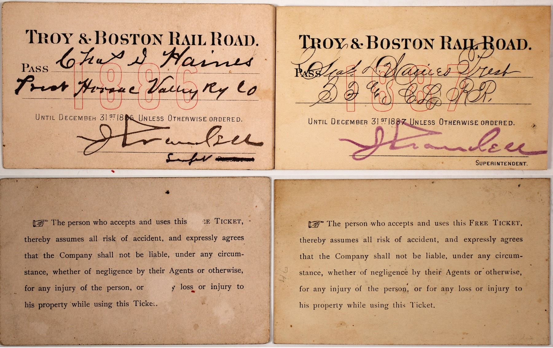 Issued in 1886 and 1887 to the same person, Charles Haines, president of the Hoosac Valley RR Co. Both are signed by the superintendent (illegible). Some soiling. One pass has paper loss on the reverse. Chartered April 4, 1848 and organized November 22, 1849. It completed a line from Troy, New York to the Vermont state line (35 miles) in 1852. (Potter Collection)