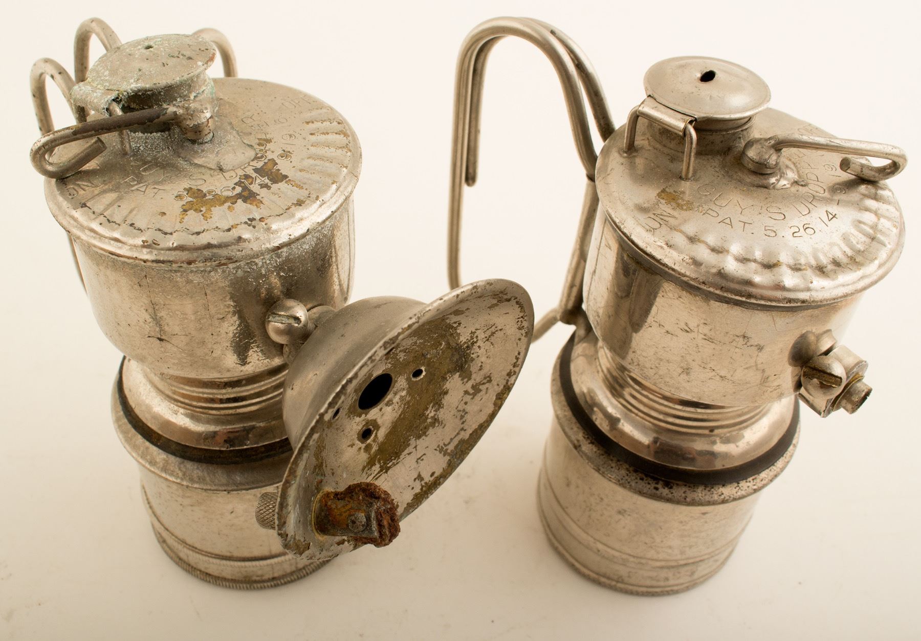 Two early 1916 Guy's Dropper lamps in nickel plate, handheld, tall model with unusual reflector. One lamp missing reflector. State: City: HWAC#: 46376 Date: