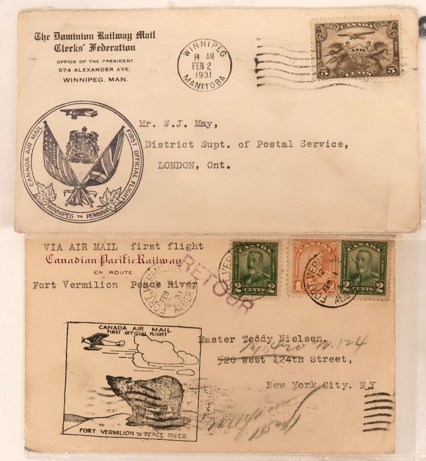 Two different 1931 First Flight Issue covers: The Dominion Railway Mail Clerks Federation corner ad., First Flight Winnipeg to Pembina; and Canadian Pacific Railway En Route, First Flight Fort Vermilion to Peace River.