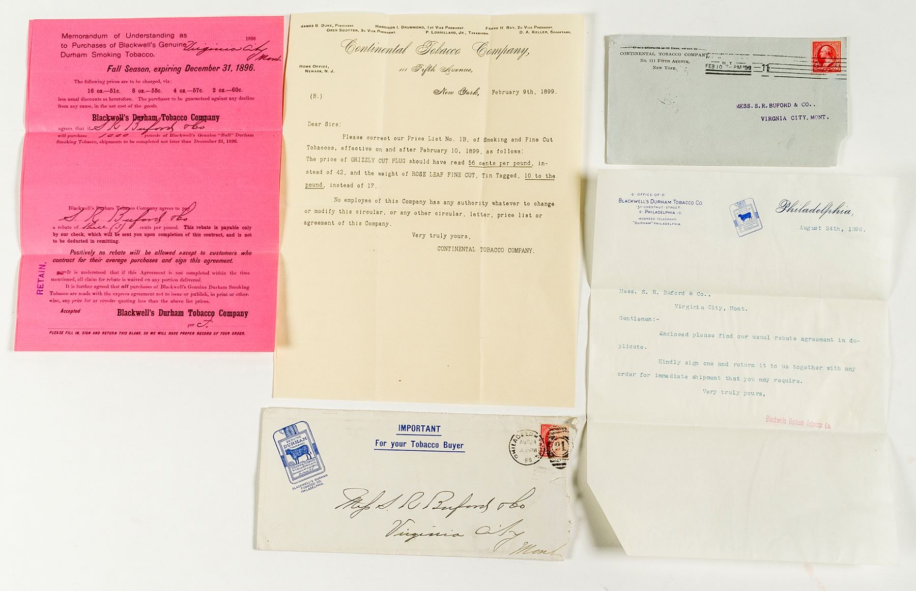 1) Blackwell's Durham Tobacco Co. addressed to Mr. Buford, Virginia City, Mont., 1896. This envelope also carried two Memos of Understanding from Blackwell's to Buford. Pink in color and nice looking! 2) Continental Tobacco Co. addressed to Mr. Buford & Co., Virginia City, Mont., 1899. Date: 1896-99 Location: Virginia City, Montana HWAC# 44153