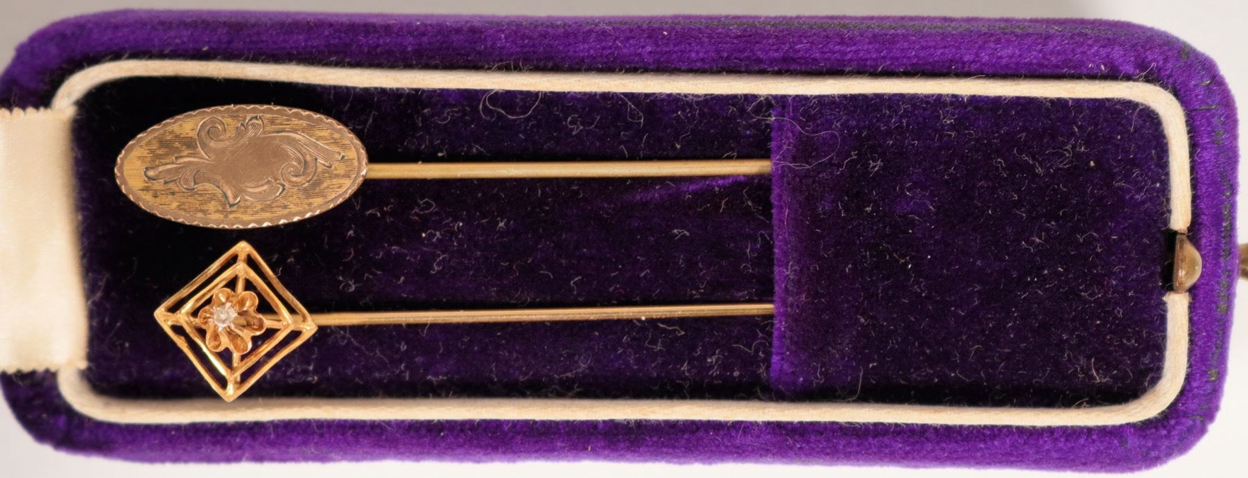 One is 14K gold with a raised diamond arte nouveau setting. The other is Victorian, 10K gold oval with an etched design. Both in purple velvet case, marked A. A. Bullard, Bath NY