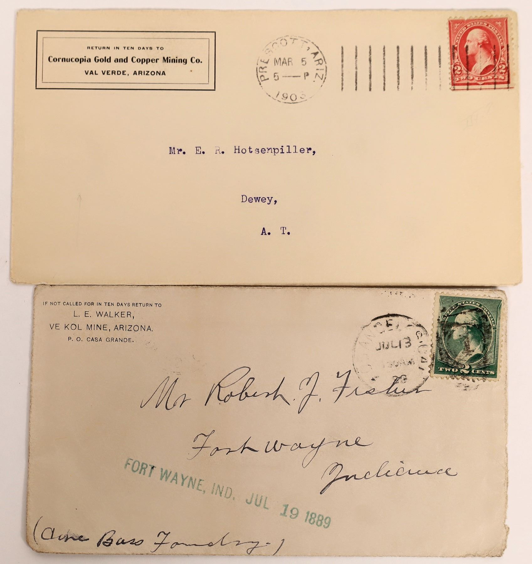 1) 1889. Corner cover for L. E. Walker, Ve Kol Mine, Arizona, O. O. Casa Grande. Fort Wayne straight line received mark. Stamped in Los Angeles. Vekol' post office was established September 25, 1888 and discontinued October 30, 1909. Located on February 5, 1880 by John D. Walker, Juan Jose Gradello and P.R. Brady, Vekol was a camp of about 150 residents. There was nothing but lawsuits in Vekol between the owners and their families and Vekol's history reflects such. Finally, the mines played out and so did the lawsuits [ghosttowns.com] 2) 1903. Corner cover for Cornucopia Gold and Copper Mining Co., Val Verdi Arizona. Written to Hotsenpiller at Dewey, A. T. In 1902 about 120 tons of ore was extracted from this mine. [Arizona, Governor's Report]