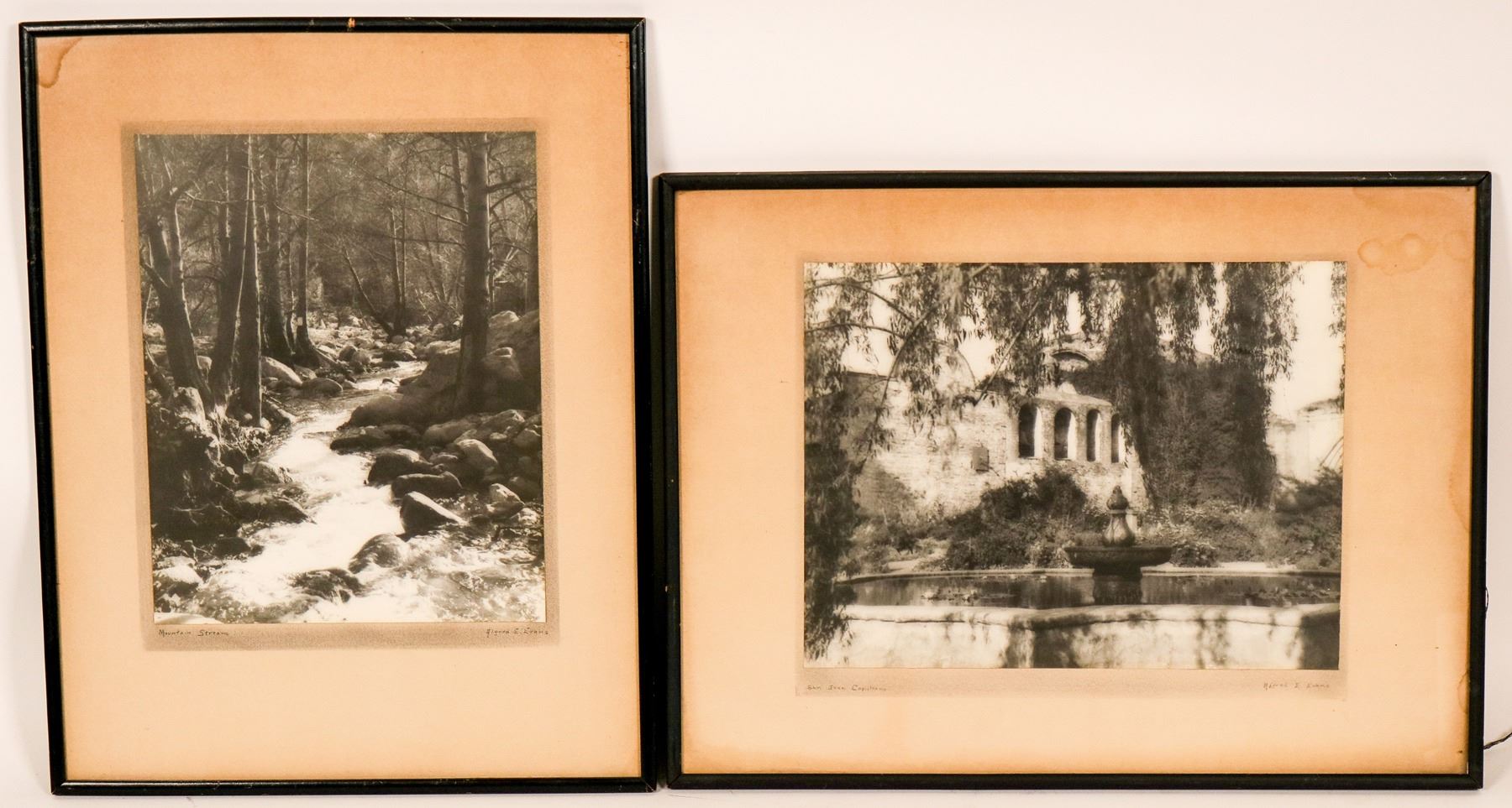 Evans work is reminiscent of Edward Weston's style. 1) Mountain Streams, b/w photo 21" x 9.75", Mounted and framed: 19.5" x 15.5". Good condition, water stain upper right corner of mat. 2) San Juan Capistrano, b/w photo-10.25" x 13.25". Image appears partially solarized. Mounted and Framed: 15.5" x 20.5". Water stained on right side of mat. It seems that Evans did some shading around each photo in light pencil.