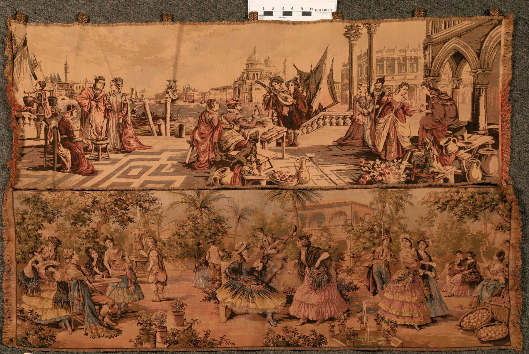 1) A Venetian scene--a gathering with gondolas in the background. Approx. 15" x 46", rich coloring. 2) A Spanish scene--party with musicians and dancers. Approx. 15" x 48". Replicas of older pieces.