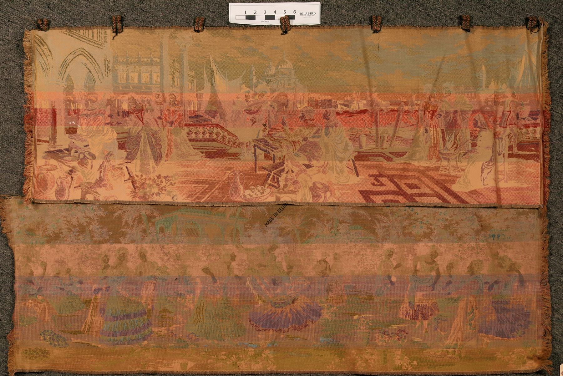 1) A Venetian scene--a gathering with gondolas in the background. Approx. 15" x 46", rich coloring. 2) A Spanish scene--party with musicians and dancers. Approx. 15" x 48". Replicas of older pieces.