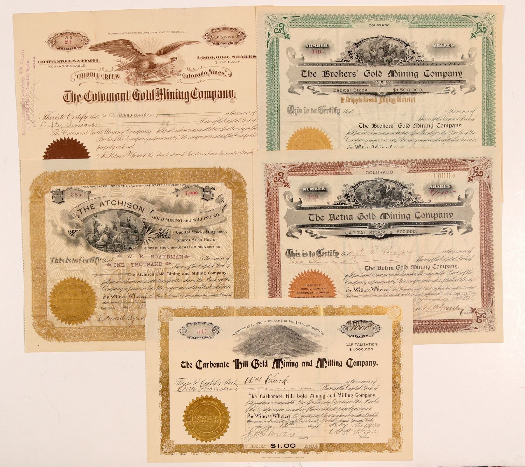 Lot of two different "Big Four" mining companies. 1) The Big Four Mining & Smelting Company. "Mines on West Spanish Peak, Huerfano Co., Colo." (printed on certificate). Dateline La Veta, Colo. No 444, issued for 8,600 shares to WA Castle on Sept. 14th, 1896. Signed by president Shaw and secretary Dickerman. Not cancelled. Black border and print, mining vignette. Pinholes, folds. 8 x 10" 2) The Big 4 Gold Mining Company. No. 1147, issued for 1,000 shares to Charles Miller in Cripple Creek on Nov. 27th, 1900. Signed by vice president and secretary. Not cancelled. Gold border and mining vignette. Folds, pinholes. 8.25 x 10" Ken Prag Collection