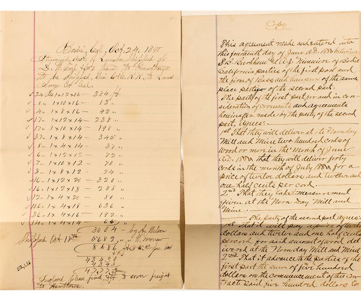 1) Handwritten copy of 1880 agreement between S.B. Burkham and A.J. Nineuire (?) of Bodie and the firm of Bass and Cameron of Bodie. The first party promises to deliver wood to the Noonday Mine and Mill. Later in the contract, it is revealed that Burkham and Nineuire sold this contract to Boone & Wright (well-known merchants in Bodie).12.5" x 7.75" with folds and light toning/soiling. 2) Handwritten account of lumber shipped by S.W. Earl & Co.'s team to Hawthorne to be shipped via the C&C.R.R. to Laws, Inyo County, Cal. Dateline Bodie, Cal, Oct. 24, 1890. 12.5" x 8" with folds and light toning. (Prag Collection)
