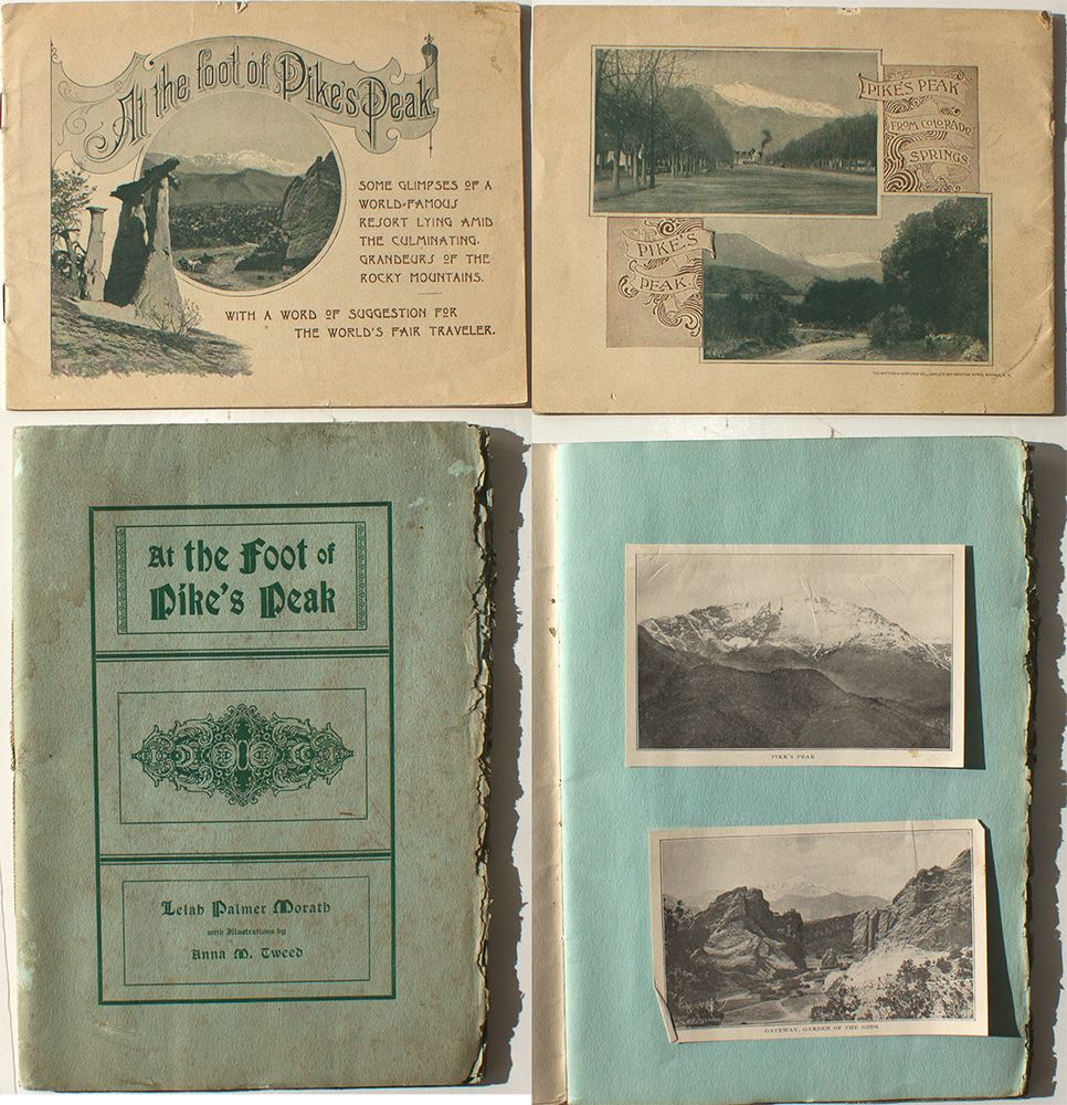 1) "At the Foot of Pike's Peak" 7" x 5". 16 Pages. Text with pictures. 2) "At the Foot of Pike's peak" 6.5" x 9" 22 pages. Copyright 1905. Poetry by Lelah Palmer Morath. With 9 pictures by Anna M. Tweed hand-glued. Ms. Tweed listed as Early Woman Photographer.