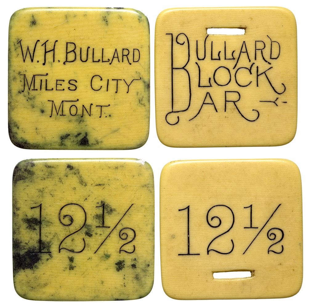 1) Square. WH Bullard / Miles City / Mont. // 12 1/2. 2) Square. Rectangular punched hole on top. Bullard / Block / Bar // 12 1/2. Interesting duo! City: Miles City State: Montana Date: ID: 36544