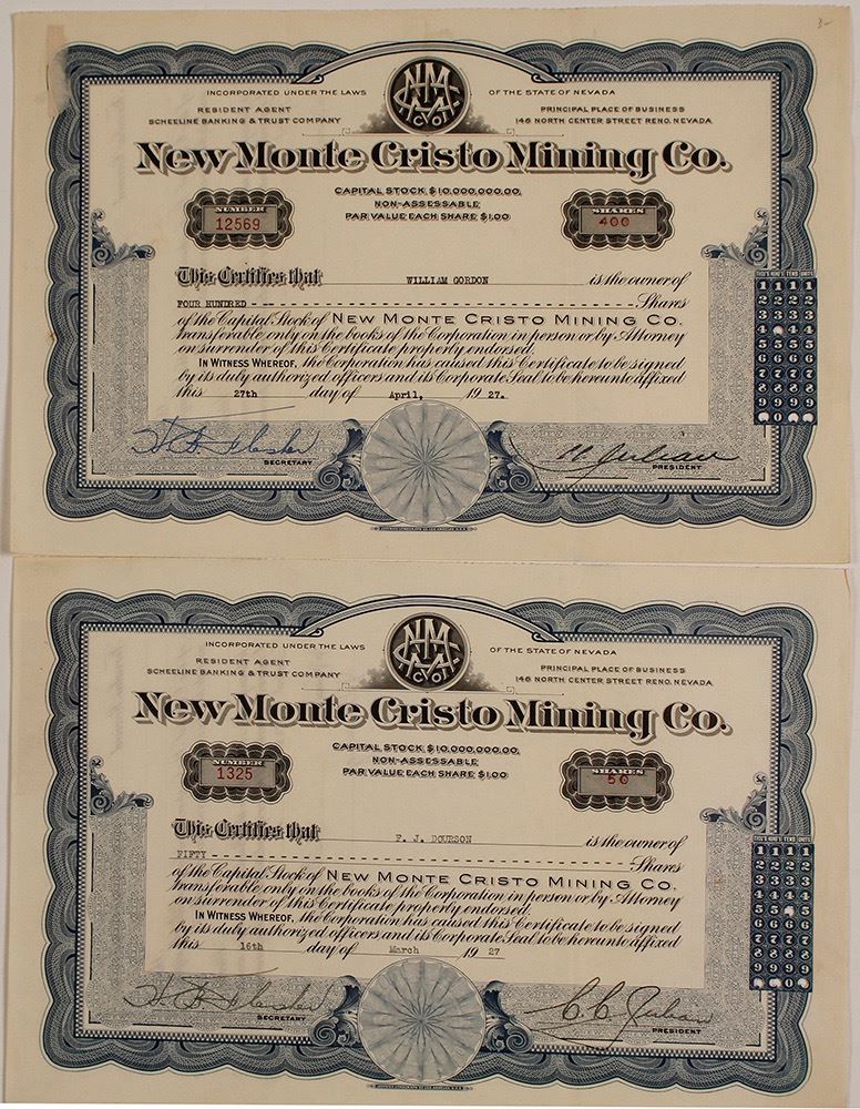 Two 1927 issued stocks for the New Monte Cristo Mining Company, a Death Valley mining scam by C.C. Julian. Julian signed both as president. Two different styles of his signature. Not cancelled. Showman and schemer CC Julian was known for his oil stock schemes in the 20s known as the "Great Los Angeles Swindle." He then ripped off a set of investors with a silver-bearing lead mine in Death Valley. In 1929, Julian left mining and returned to oil schemes, taking his own life 5 years later. The New Monte Cristo Mining Company was a consolidation of multiple mines including the Monte Cristo in Arizona. (This company was not affiliated with the famous Monte Cristo Mine in the Angeles National Forest just north of Los Angeles). (Prag Collection) Date: Location: Arizona HWAC# 55668