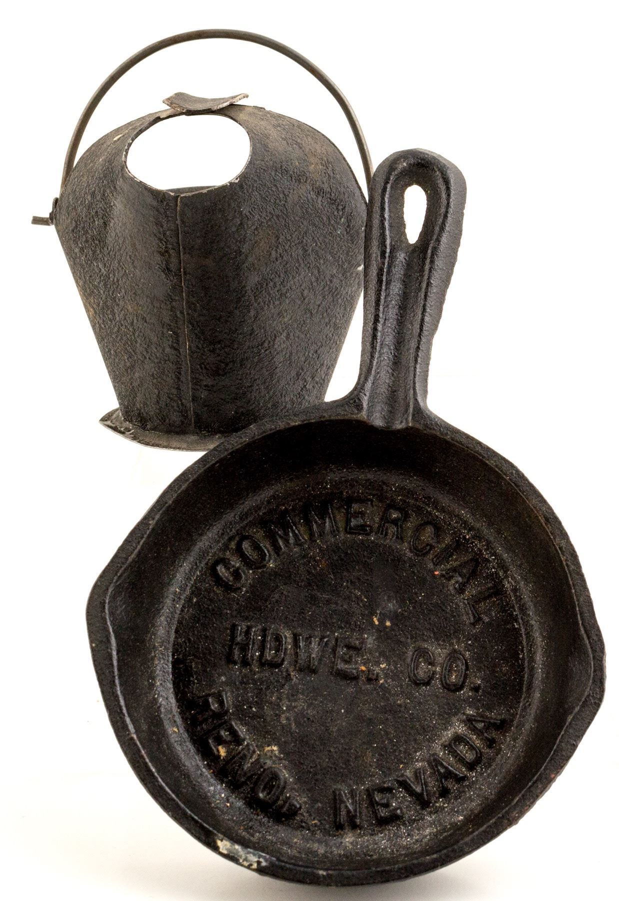 1) Coal bucket from the Armstrong Wood & Coal Company. The phone number is 5141. Old! 3" tall. 2) Frying pan advertising Reno's iconic Commercial Hardware. 6" in total length. State: Nevada City: Reno HWAC#: 47316 Date: