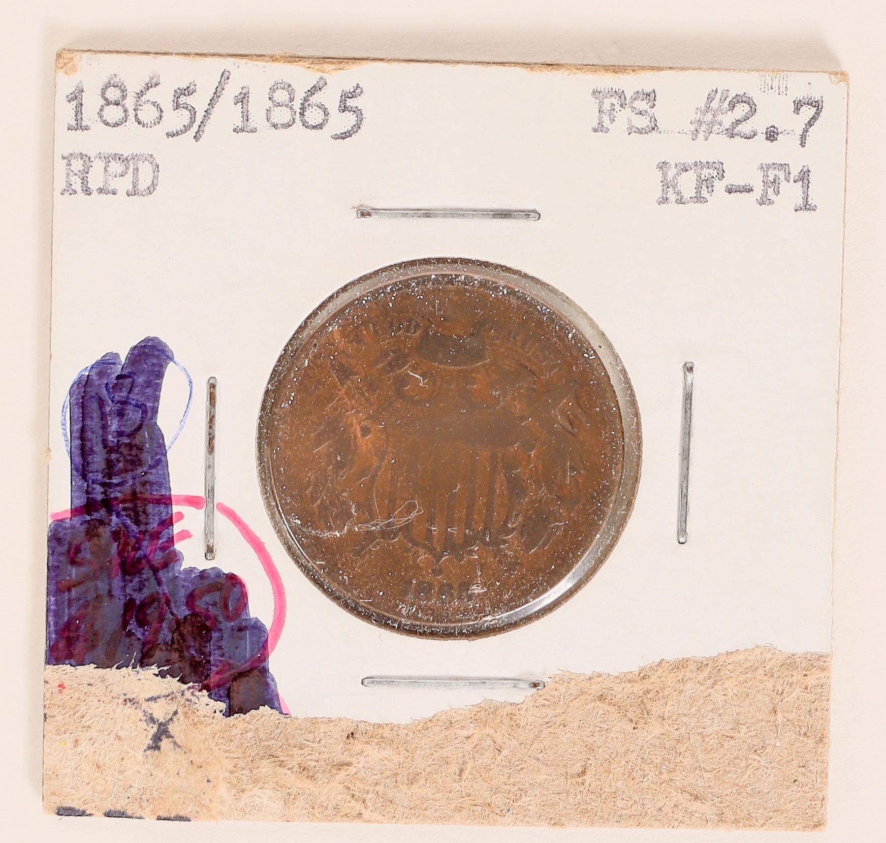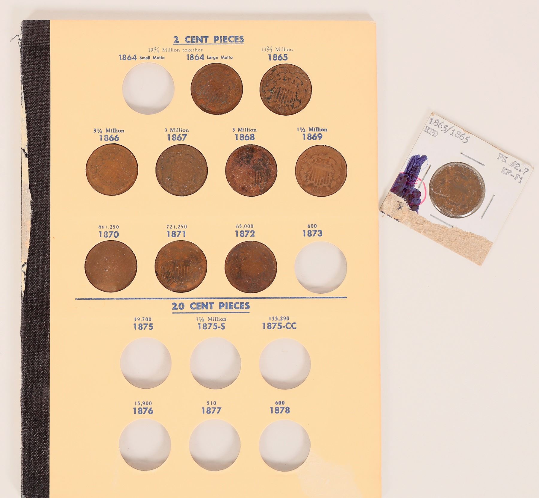 Album page with ten two cent pieces: 1864; 1865; 1865/1865; 1866; 1867; 1868; 1869; 1870; 1871; 1872. All well circulated: G-VF condition.