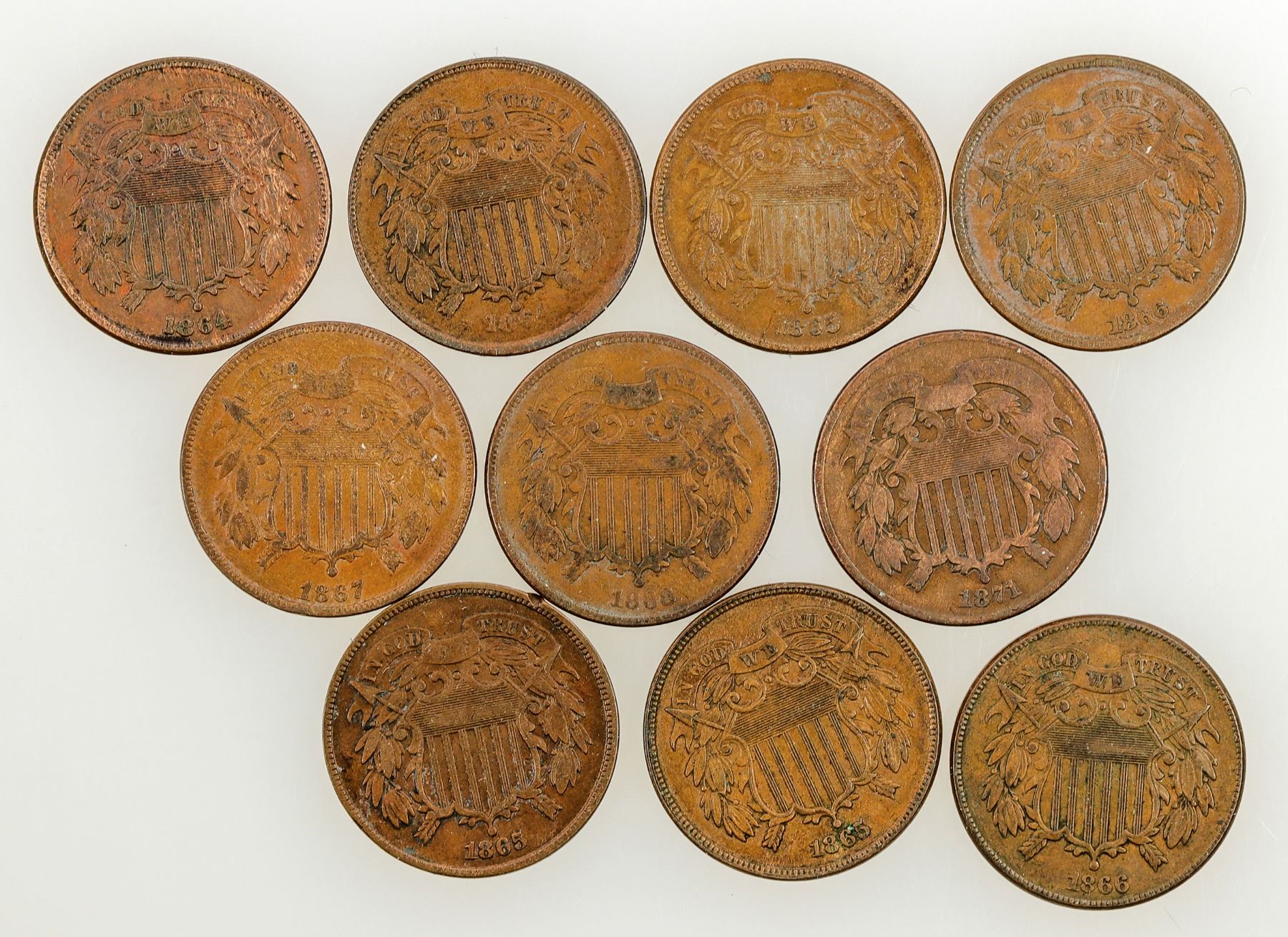 Lot of ten two cent pieces, G-VG condition: 1864 (2); 1865 (3); 1866 (2); 1867; 1868; 1871.