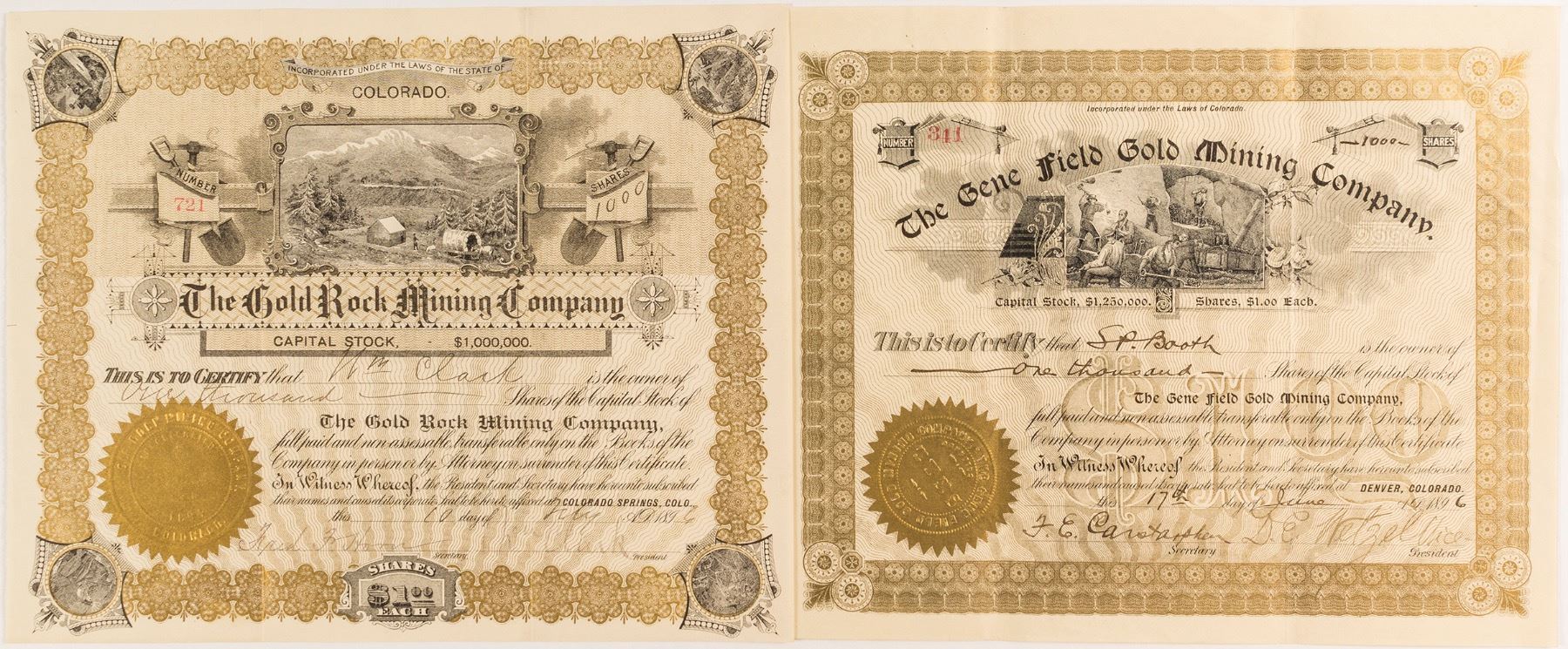 Gold Rock Mining Co I/U 1896 to and signed by WM Clark #721 1000 shares, tent and covered wagon vignette. Gene Field Gold Mining Co. in Cripple Creek I/U to SP Booth 1896 #341 1000 shares, underground miners vignette. Both 8"x 10". Date: Location: Cripple Creek, Colorado HWAC # 54354