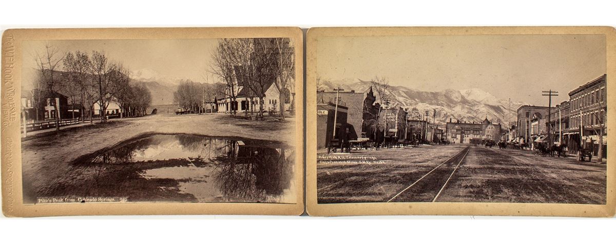1) A view of Pike's Peak from Colorado Springs. The photographer, W. E. Hook, has managed to catch a residential street with the Peak in the background. He also catches a mirror image in a pool of water on the street. This photograph is worthy of an award. 2) Another view of the Peak, but this time from the business district. Contrast is so sharp you can read words like "Stable", "Livery," "J Davis", Mangs Organs" through the trees, "Yang Chinese and Japanese Curiosity". Photographer is J. L. Clinton of 18 South Tejon Street, Colorado Springs. Both are 8 x 5"
