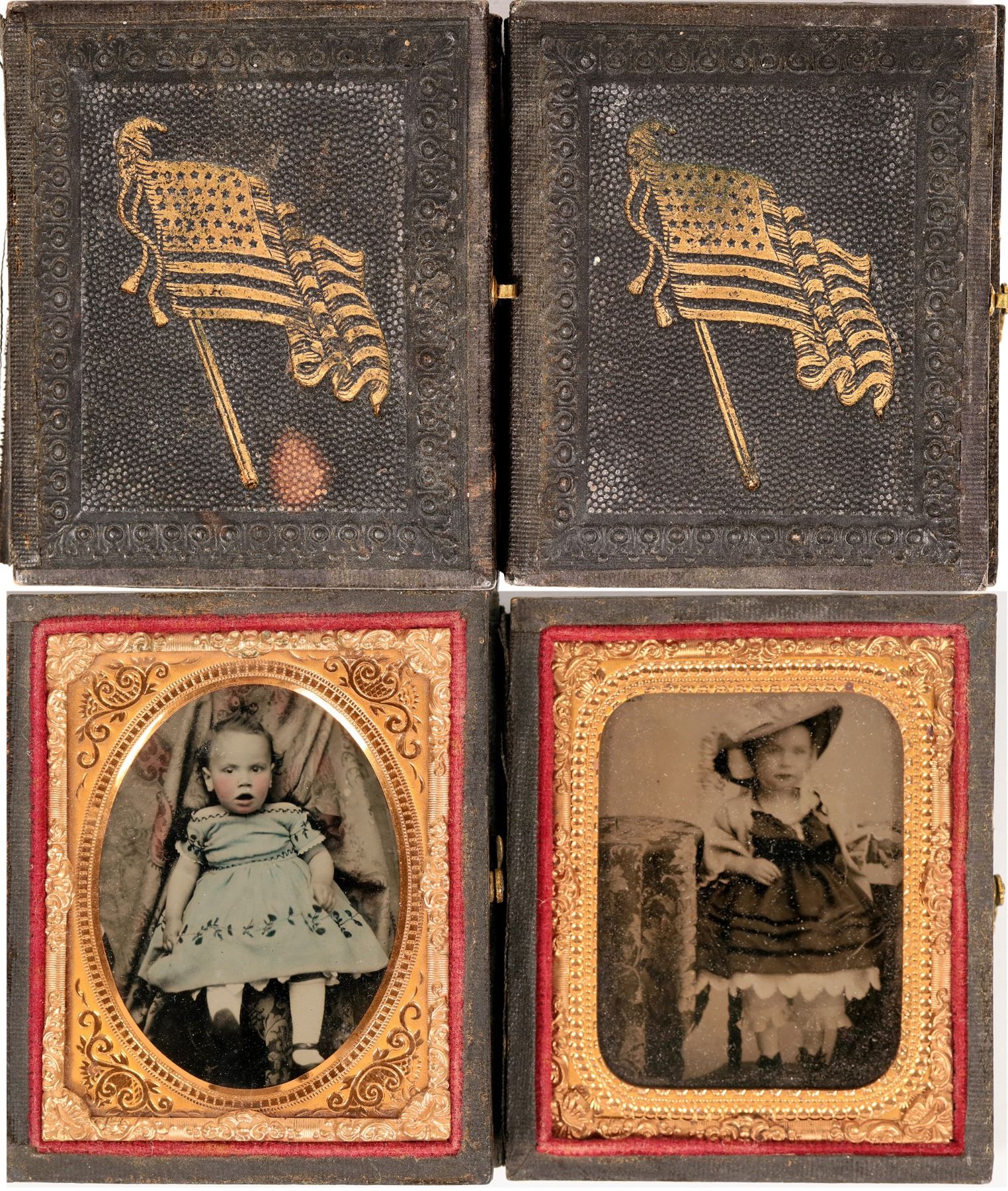 Two patriotic photo cases (Embossed with American flag) containing photos of two young children. Hinges are broken, but hasps still work. They measure 3"x 2.5". Photos are in good condition. See photos for more detail.