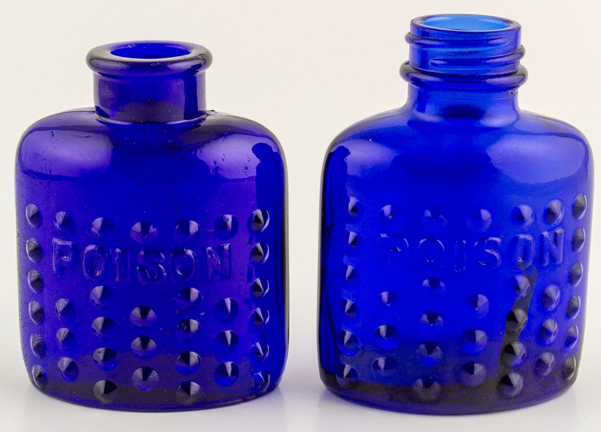 Beautiful oval shaped cobalt blue poison bottle. Circa 1890-1900. This deep cobalt bottle is embossed on the bottom “Davison, Gregory, Brooklyn, New York USA.” Deep cobalt, choice mint, outstanding example. This lot also contains a nearly identical bottle with the screw top. Both bottles have raised pointed circles as a design. Our collectors tell us this screw top version is much rarer than the tooled top version. This screw top bottle unfortunately has a very hard to see crack in the base. The crack has been slightly discolored by the original contents. See Polak fifth edition, p 289. City: State: Inventory Number: 38961
