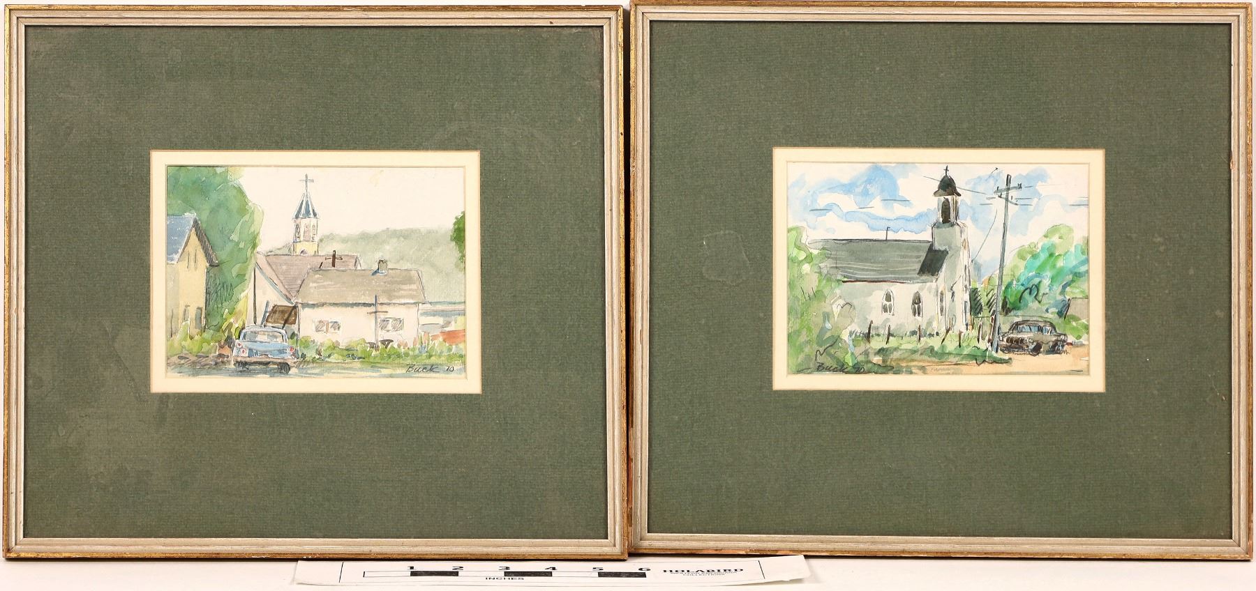 Lot of two professionally framed and double-matted paintings. Church at Blanca, Colorado and Church at San Luis, Colorado by Luke Buck. Both are signed and dated watercolor and graphite paintings. 1) Church at Blanca, Colorado. Signature and date are in graphite at the bottom left corner of the painting. Signature reads "Buck", and it is dated 1970. Written in pen in the top right on the back of the frame is a note from the artist reading, "Church at Blanca Colorado, Aug 1970". Frame dimensions are 13-9/16 x 12-1/16 inches. Painting in matte opening dimensions are 6-9/16 x 4-7/8 inches. 2) Church at San Luis Colorado by Luke Buck. Signature and date are in graphite at the bottom right corner of the painting. Signature reads "Buck", and it is dated 1970. Written in pen in the top right on the back of the frame is a note from the artist reading, "Church at San Luis Colorado, Aug 1970". Frame dimensions are 13-9/16 x 12-1/16 inches. Painting in matte opening dimensions are 6-9/16 x 4-7/8 inches.
