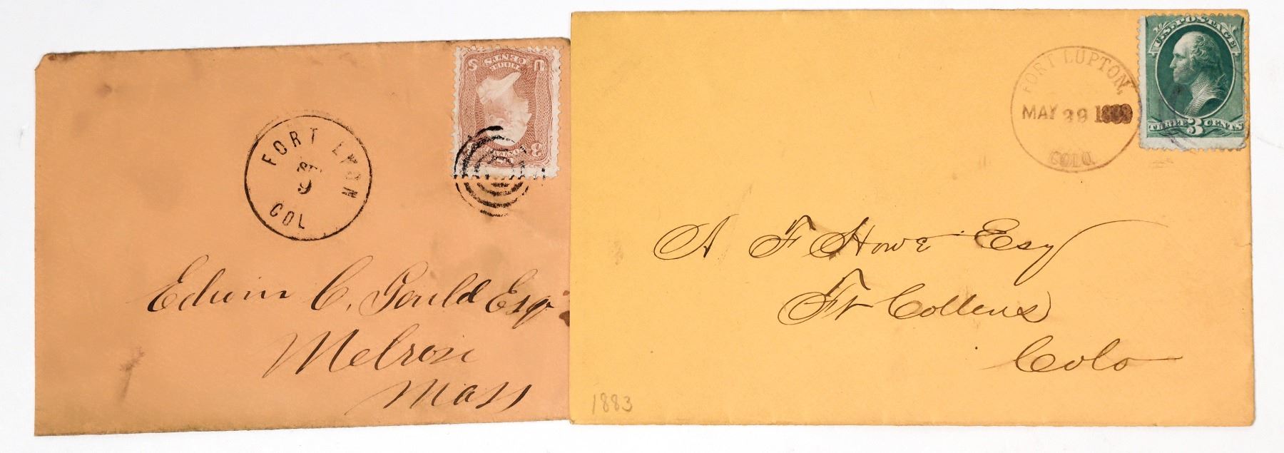 Lot of 2 different. 1) Fort Lyon (1862-1889). Huerfano County. Cover sent to Melrose, Massachusetts. Target killer on upside down 3 cent stamp. No year. 2) Fort Lupton. Weld County. Sent to Ft. Collins. 1880s postmark, smudged (1883?). Green 3 cent stamp with target killer.