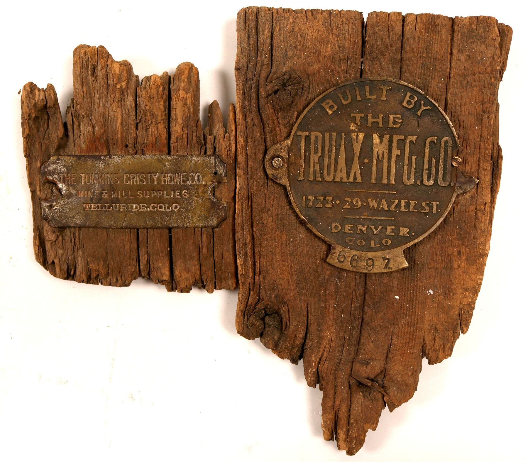 1) "The Tomkins-Cristy Hdwe Co., Mine & Mill Supplies, Telluride, Colo." 4 x 1.5". The building is now houses Patagonia Sportswear. Originally built in 1892 for the San Juan Hardware Company, the Tomkins-Cristy Hardware Company came along in 1896. They occupied the building until 1923 or 1924. 2) "Built by the, Traux Mfg. Co., 1722 29 Wazee St., Denver, Colo., 6697". The Pacific Coast Miner of 1903 reported that the Traux Mfg. Co. as busy with orders from Montana, Idaho, Missouri, Dakota and Mexico.