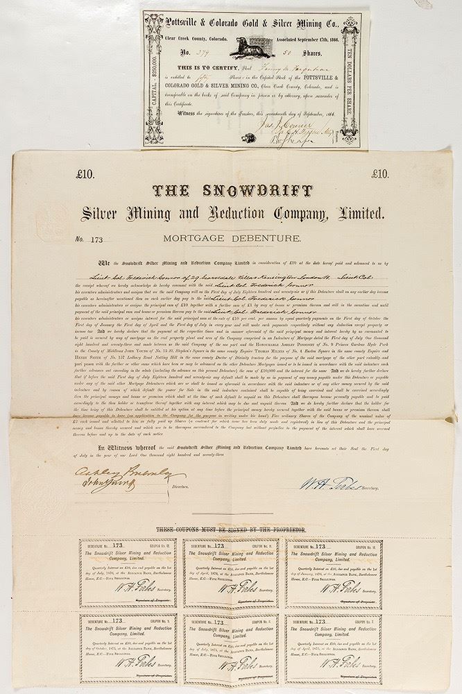 1) Pottsville & Colorado Gold and SIlver Mining Company. Number 298 for 50 shares to Fanny Farquhar(?). Has the famous dog guarding the gold bars pictorial. Signed by James Conner per CH Tyson and PW Sheaper. Vignette of a large dog guarding a crate. This company was located in or near Georgetown. Excellent condition. One horizontal fold. 2) Snowdrift Silver Mining and Reduction Company. English Mortgage Debenture Number 173 with six coupons still attached. To Frederick Connon of Scarsdale Villas, Kensington. Number 169. The Snowdrift seems to be one of the earliest mines sold to an English company from Colorado. John Collom and the British and Colorado Bureau arranged this in 1871. Ernest Le Neve Foster and Captain Bennett seemed to be in charge of this mine and the Silver Plume during this time. [British Investments in the American Mining Frontier, by Spence] Rips at folds. 21 x 17". Date: 1866, 1873 Location: Colorado HWAC # 44027