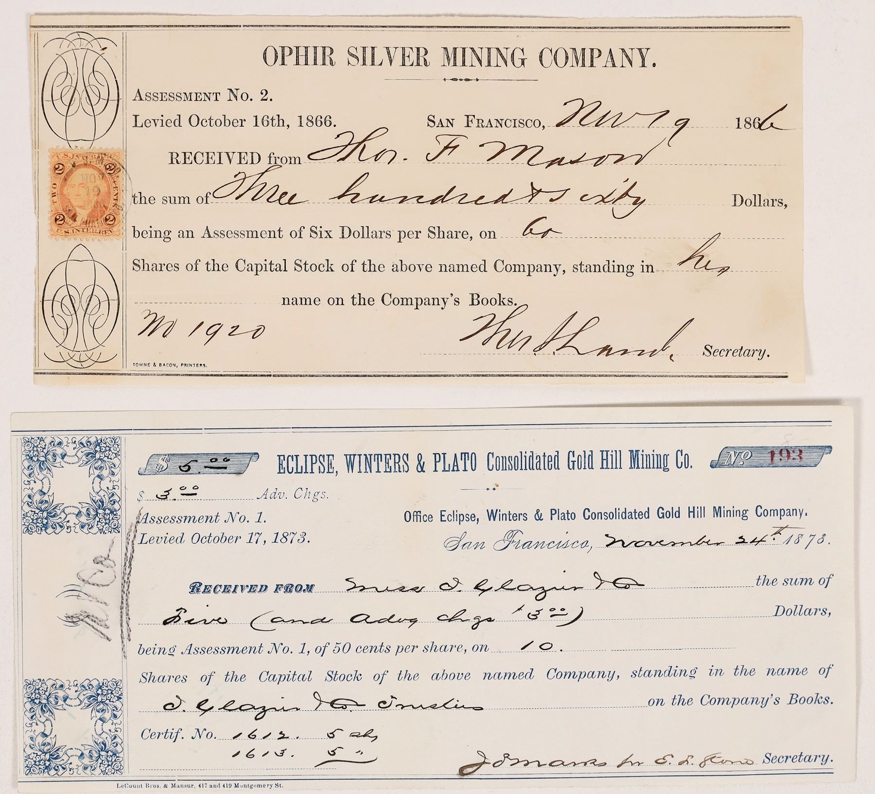 Lot of 2 different. 1) Ophir Silver Mining Company. San Francisco, 1866. Assessment on Thos. Mason for his 60 shares. Signed by the secretary. 2 cent US IR stamp. 2) Eclipse, Winters & Plato Consolidated Gold Hill Mining Company. San Francisco, 1873. Assessment on I. Glazier & Co. for their 10 shares. Signed by the secretary. These three original Comstock claims located in Gold Hill were shown in the Mining Atlas accompanying Volume III of the U.S. Geological Exploration of the Fortieth Parallel by Clarence King in 1870. The company was later absorbed by William Sharon on April 13, 1876, into the Consolidated Imperial which had increased its shares to 500,000. Sharon also absorbed the adjacent properties including the Imperial Silver Mining Co., Empire, Consolidated Gold Hill Quartz, Gold Hill Mining Company, French Gold Hill Mining Company, Bacon Mill & Mining Co., and the Bowers Mining Co., all basically constituting the smaller Gold Hill mining companies.