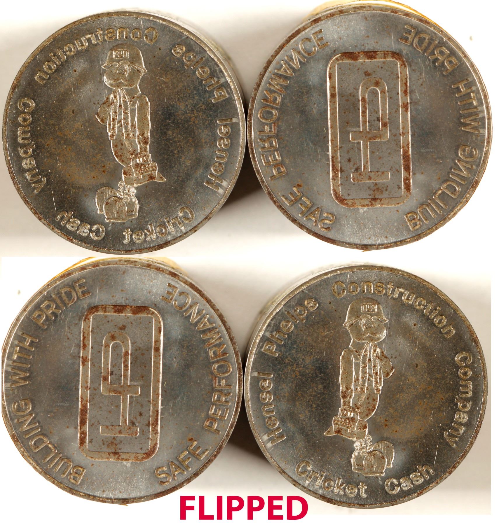 Hensel Phelps Construction Company medal die, "Cricket Cash" motto, construction worker design; "BUILDING WITH PRIDE, SAFE PERFORMANCE" mottos, design of "P" in a box; both 1.5" diameter. NWT Mint Historical Die Collection.