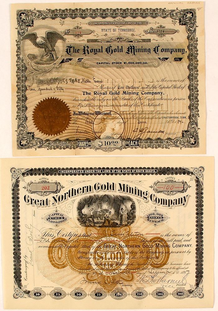 1) Great Northern Gold Mining Company. Inc. in South Dakota. No. 202, issued for 100 shares to J. Templeton on Dec. 10th, 1897. Signed by the vice president and secretary. Not cancelled. Mining vignette and gilt RN facsimile underprint. Punch hole, very fine. 2) The Royal Gold Mining Company. Inc. in Tennessee. No. 114, issued for 150 shares in 1896. Signed by the president and secretary. Not cancelled. Eagle vignette. Archival repairs. (Al Adams Gold Rush Memorabilia Collection) Date: Location: South Dakota HWAC# 59074