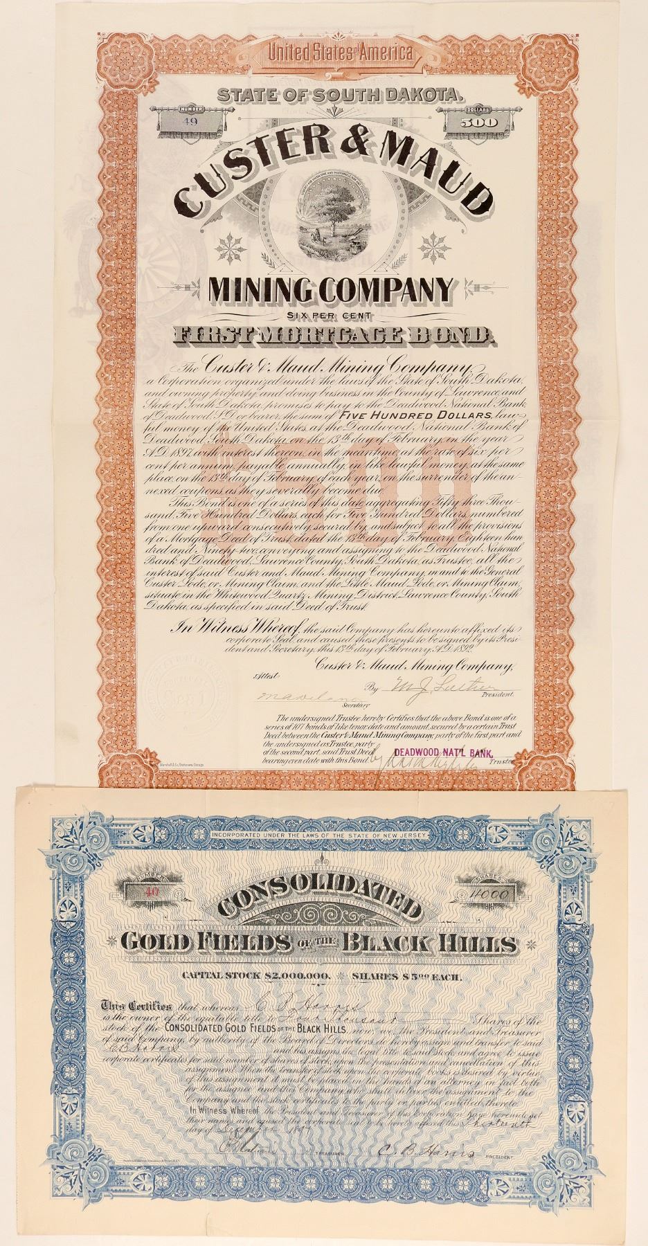 Lot of 3 different. 1) Collingwood Mining Company of Deadwood, Dakota. Stock No. 32, issued to August Chedin for 5,000 shares on Sept. 3rd, 1896. Signed by vp Sol Jefferson and secretary Frasier. Not cancelled. Location of Mines: Carbonate, Dakota. Deep folds, some soiling. 2) Custer & Maud Mining Company. $500 bond No. 49 issued in 1892 by the Deadwood National Bank. Not cancelled. Three coupons attached. Brown border and pastoral vignette. Bond states that the mining claims are the General Custer Lode and the Little Maud Lode in the Whitewood Quartz Mining District, Lawrence County. Folds, ver clean. 3) Consolidated Gold Fields of the Black Hills stock No. 40, issued in 1897 to the company president, C.B. Harris, for 4,000 shares. Not cancelled. Blue border and black print. Pinholes, deep folds. Ken Prag Collection