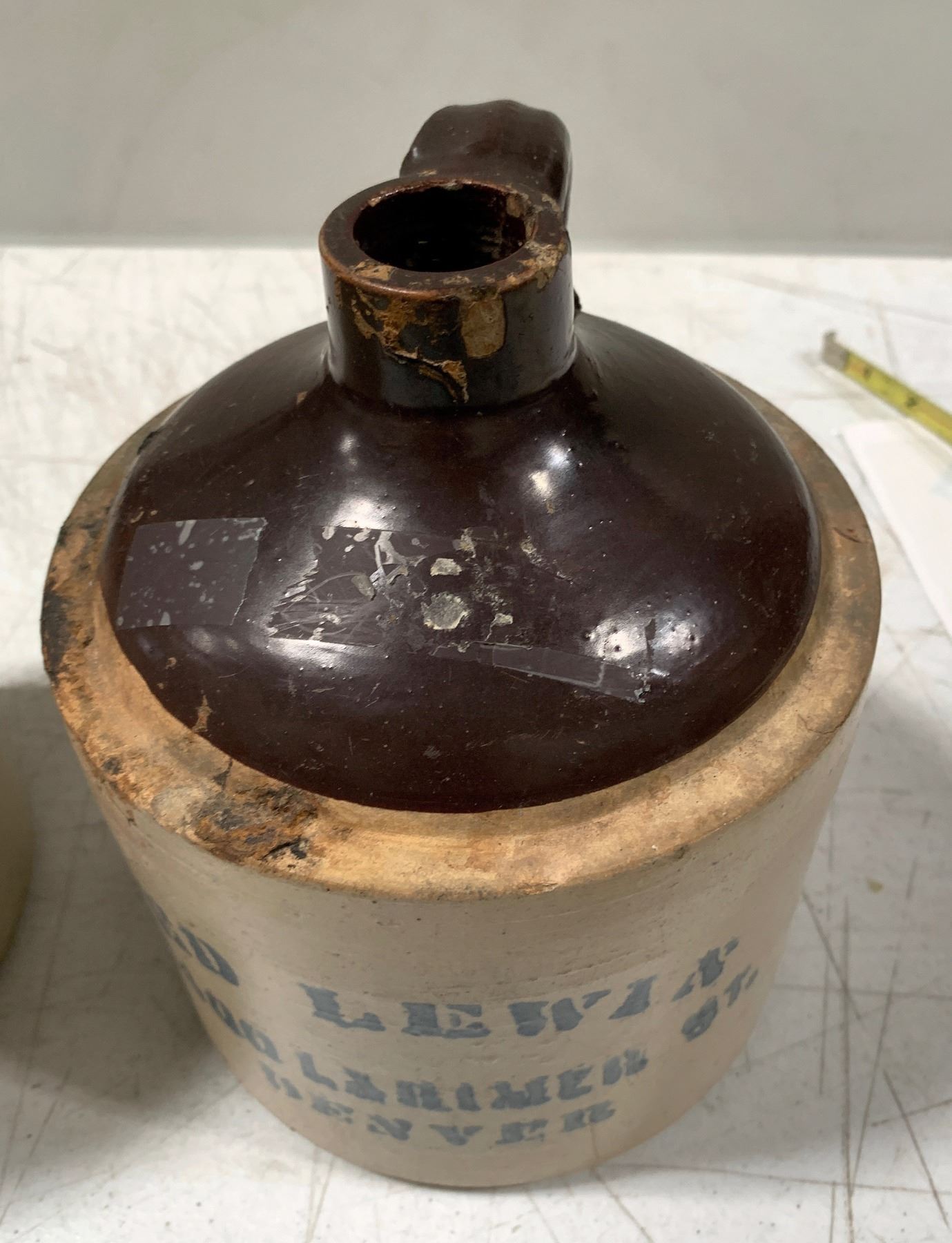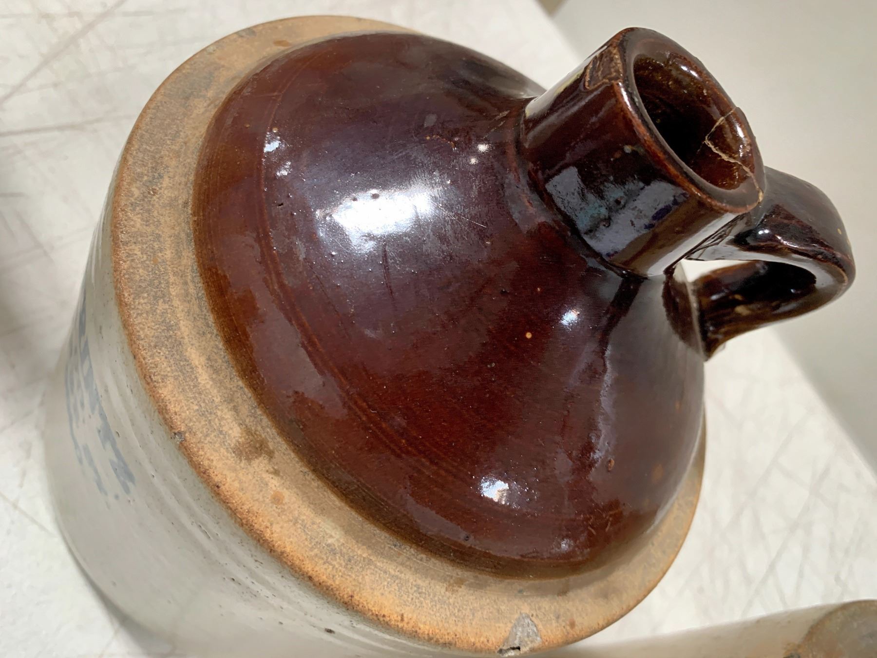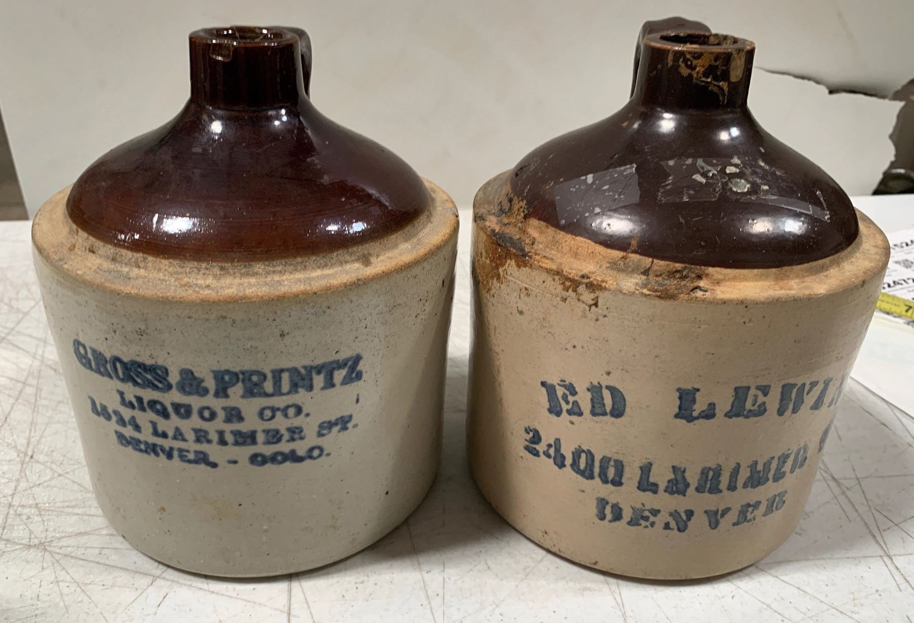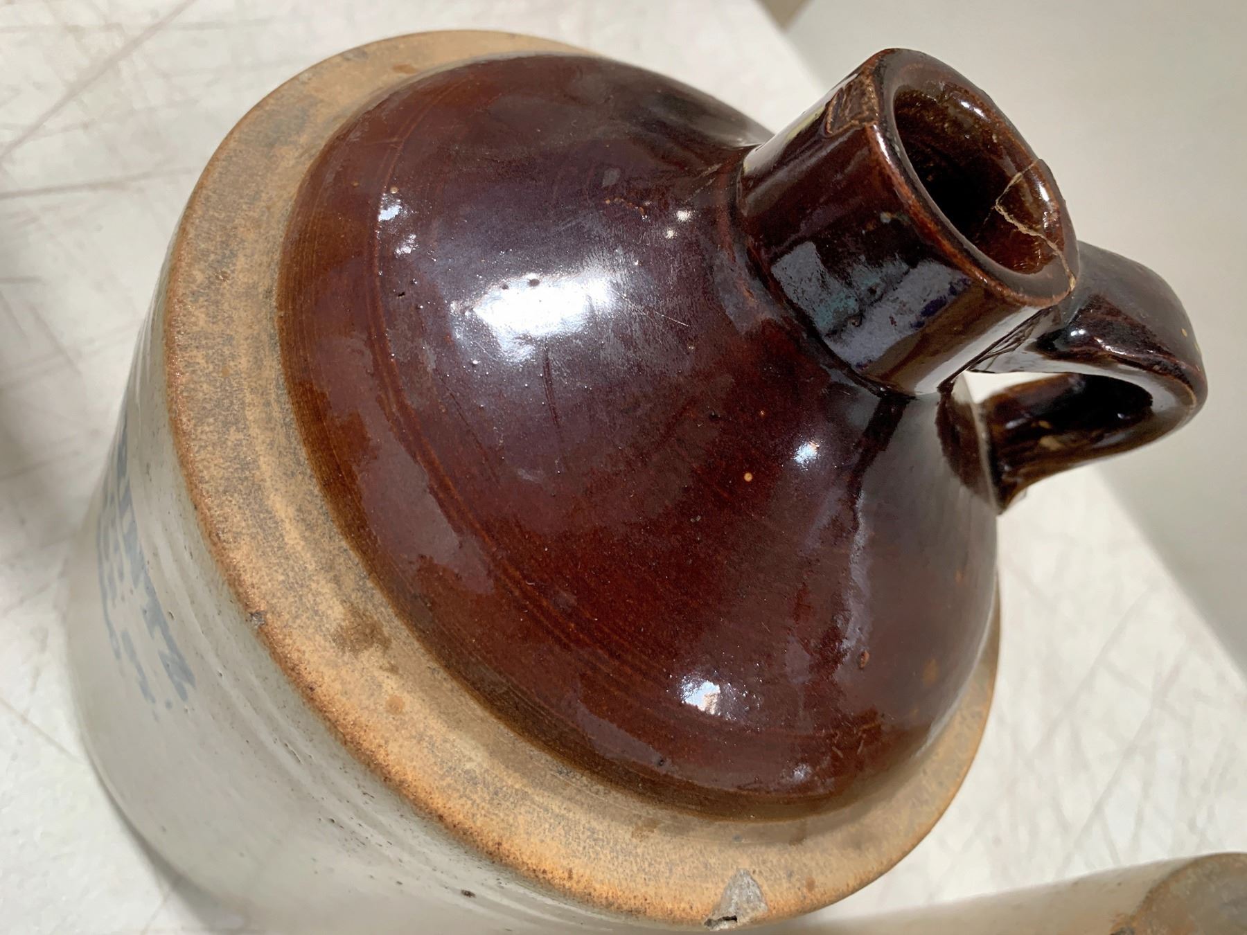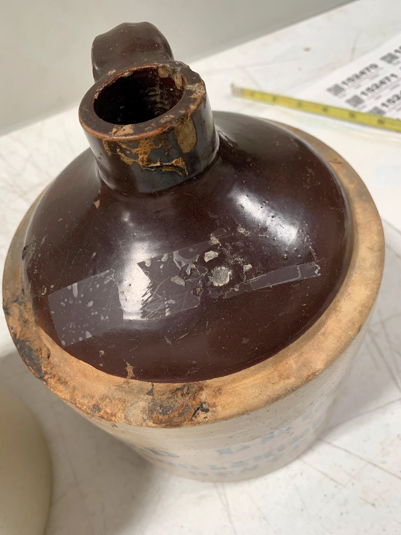 Lot of 2 different. 1) Gross & Printz. J-178 in Preble. Crack at lip/handle junction. Pre-fire lip chip. 2) Ed Lewin. J-91 in Preble. Scotch tape residue. Two lip chips. Each is 6" diam, 7.5" tall.