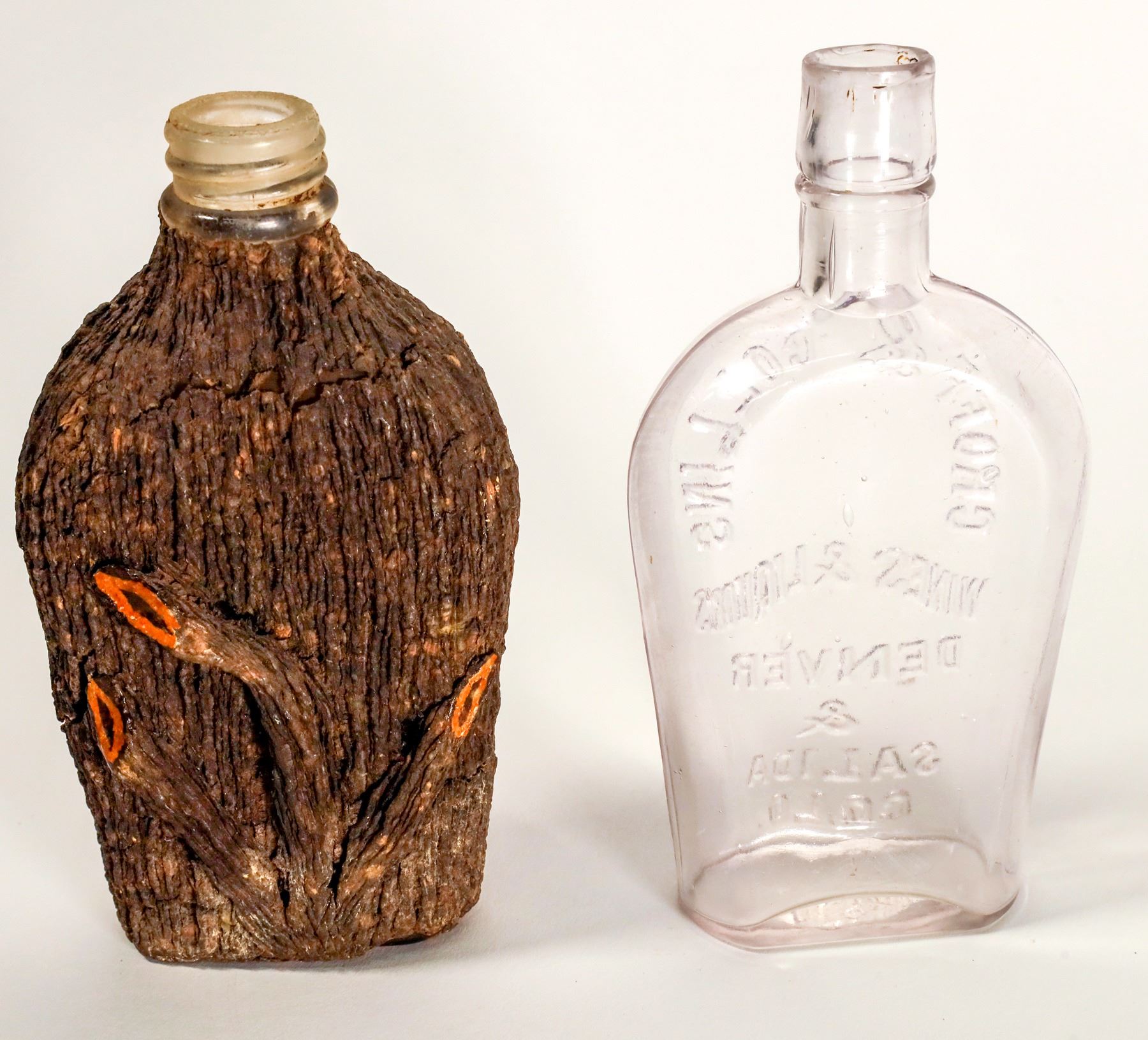 1) M Sammitzer Wines Liquors and Cigars. Ground top. Bark covered paper label inserted into glass. Half pint. 2) Croff & Collins wines and liquors. Denver and Salida. Half pint. Air bubble on left side has been penetrated. Otherwise nice.
