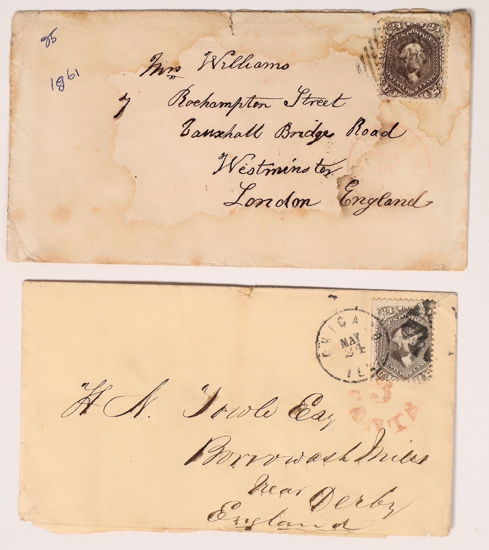 Both addressed to England. Both are A29. One had a stamp on back that says London SW 63. The other has an unusual additional 3c red stamp. Both are c1860.